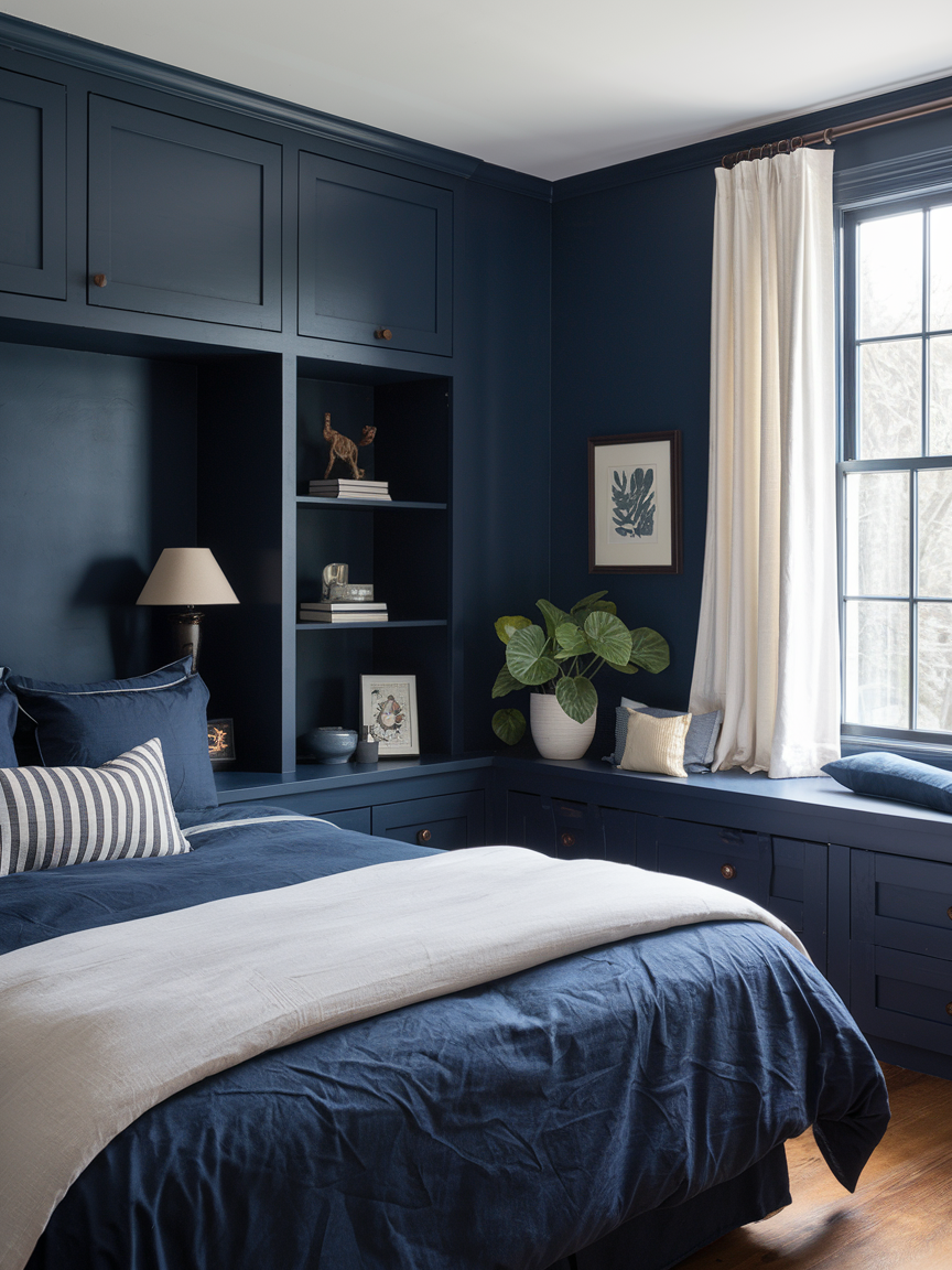 Built-in storage painted in navy offers both functionality and visual cohesion in the bedroom. Custom wardrobes, shelving, or cabinetry blend seamlessly with navy walls, creating a streamlined and intentional look. This approach reduces clutter, which is essential for maintaining a relaxing sleep environment. Navy enhances the architectural presence of built-ins, making them feel like a design feature rather than a necessity. Styled thoughtfully with minimal décor or neatly arranged essentials, built-in storage supports both organization and elegance. The deep color adds richness while maintaining calm, resulting in a bedroom that feels polished, practical, and beautifully designed.
