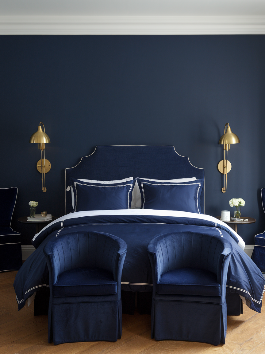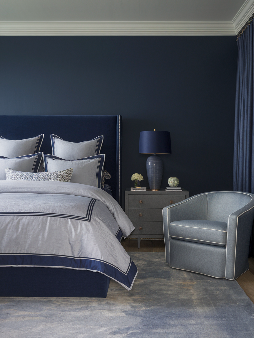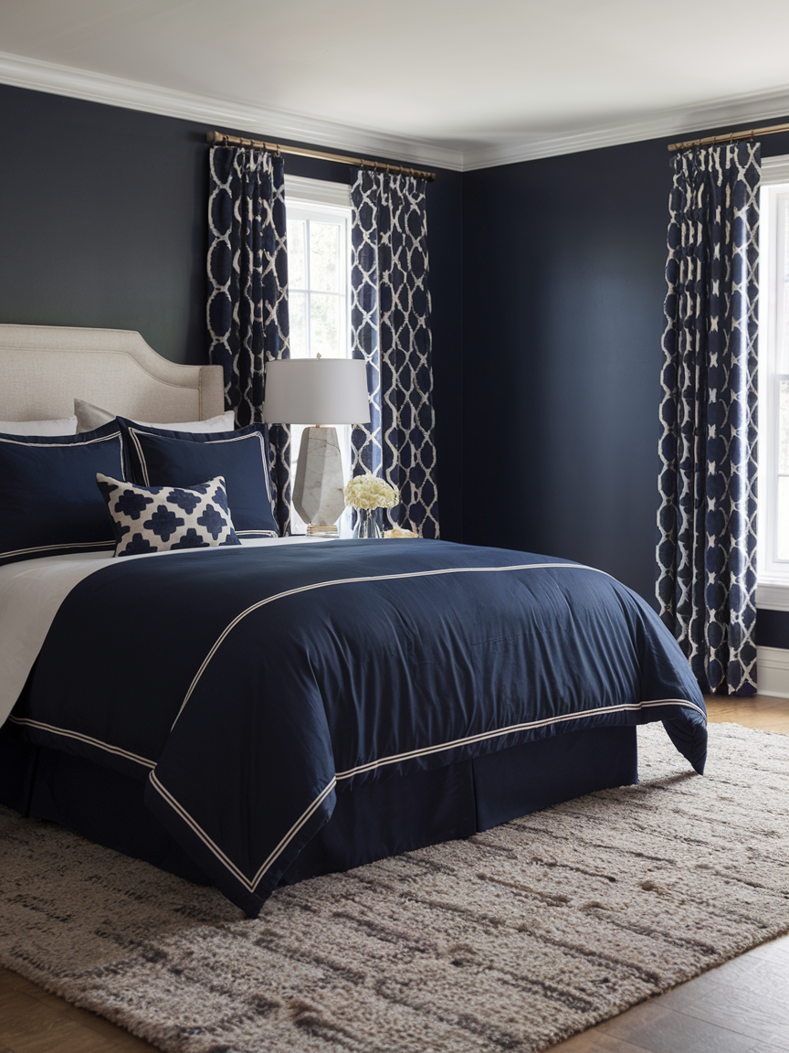 A well-designed navy bedroom goes beyond wall color to create a truly restful space. Layered textiles, plush bedding, warm wood accents, and soft lighting help balance the depth of navy and prevent the room from feeling too heavy. Subtle metallic details and light-colored accessories add contrast, enhancing the elegance of the space while maintaining a tranquil mood.