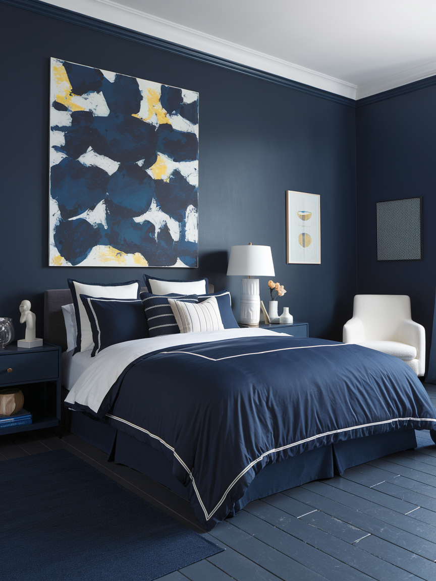 22. Navy Bedroom with Artful Décor