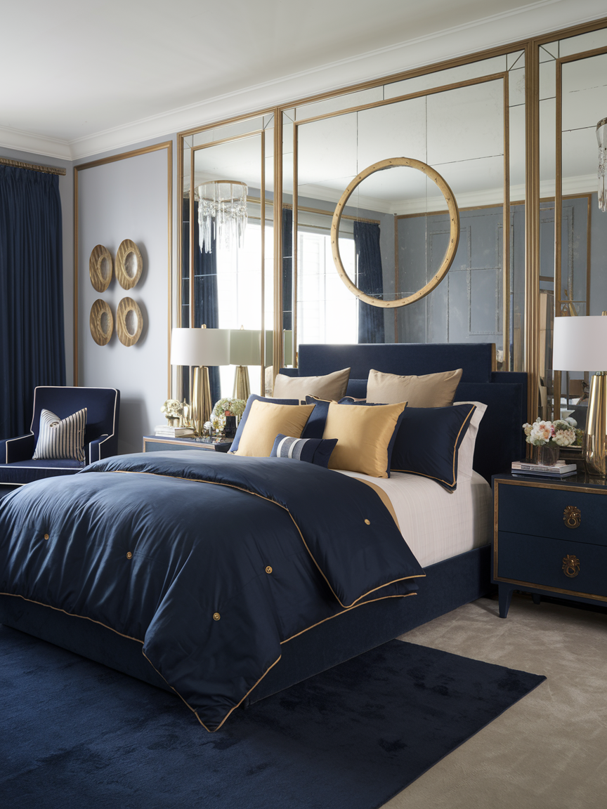 Gold accents add warmth and refinement to navy bedrooms, creating a look that feels luxurious without being overdone. The warm metallic tones contrast beautifully with navy’s cool depth, enhancing its richness. Gold can be introduced through lighting fixtures, mirrors, drawer pulls, or decorative accessories. When used sparingly, it adds a touch of elegance that elevates the overall design. This pairing works particularly well in chic, modern, or classic interiors where sophistication is key. Navy and gold together create a bedroom that feels polished, stylish, and indulgently calm.