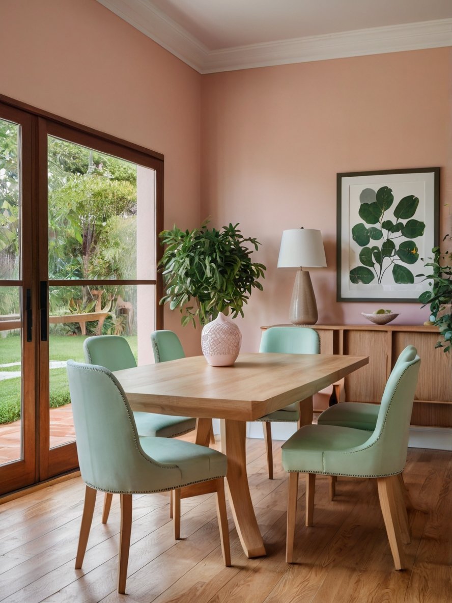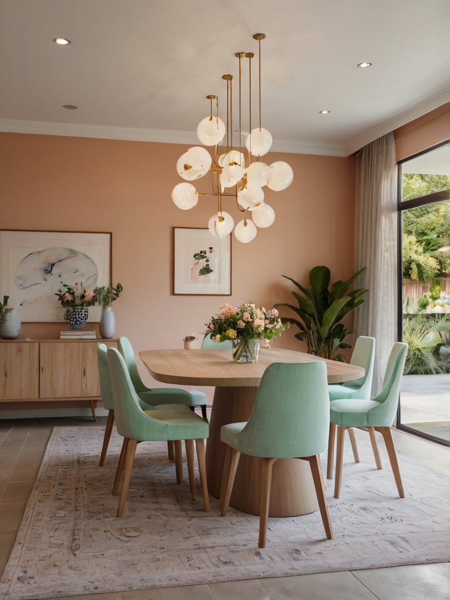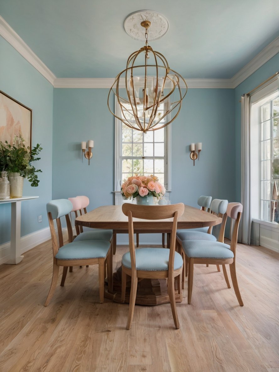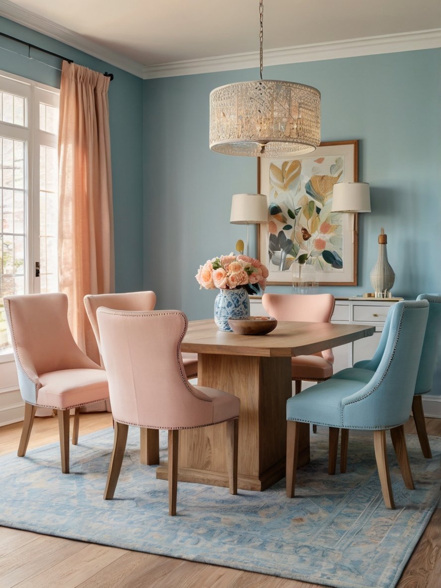 This dining room beautifully balances pastel hues, creating a serene and inviting atmosphere. The soft blue walls act as a tranquil backdrop, while the mix of blush pink and muted blue chairs adds a delightful contrast. These colors evoke a sense of calmness and warmth, making the space feel both stylish and welcoming. The pastel peach curtains subtly complement the overall scheme, ensuring the palette remains cohesive. The light wood tones from the dining table and flooring introduce a grounding element, preventing the space from feeling overly delicate. This carefully curated color selection enhances the dining room’s inviting ambiance, making it a perfect setting for both casual and formal gatherings.