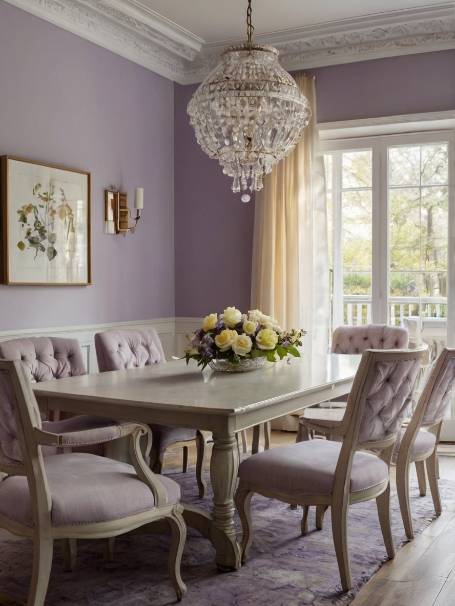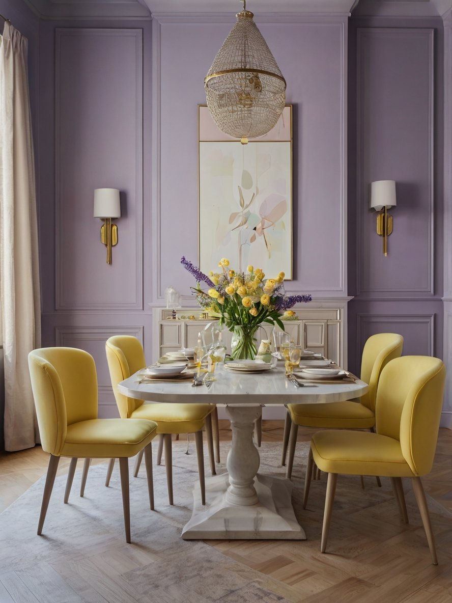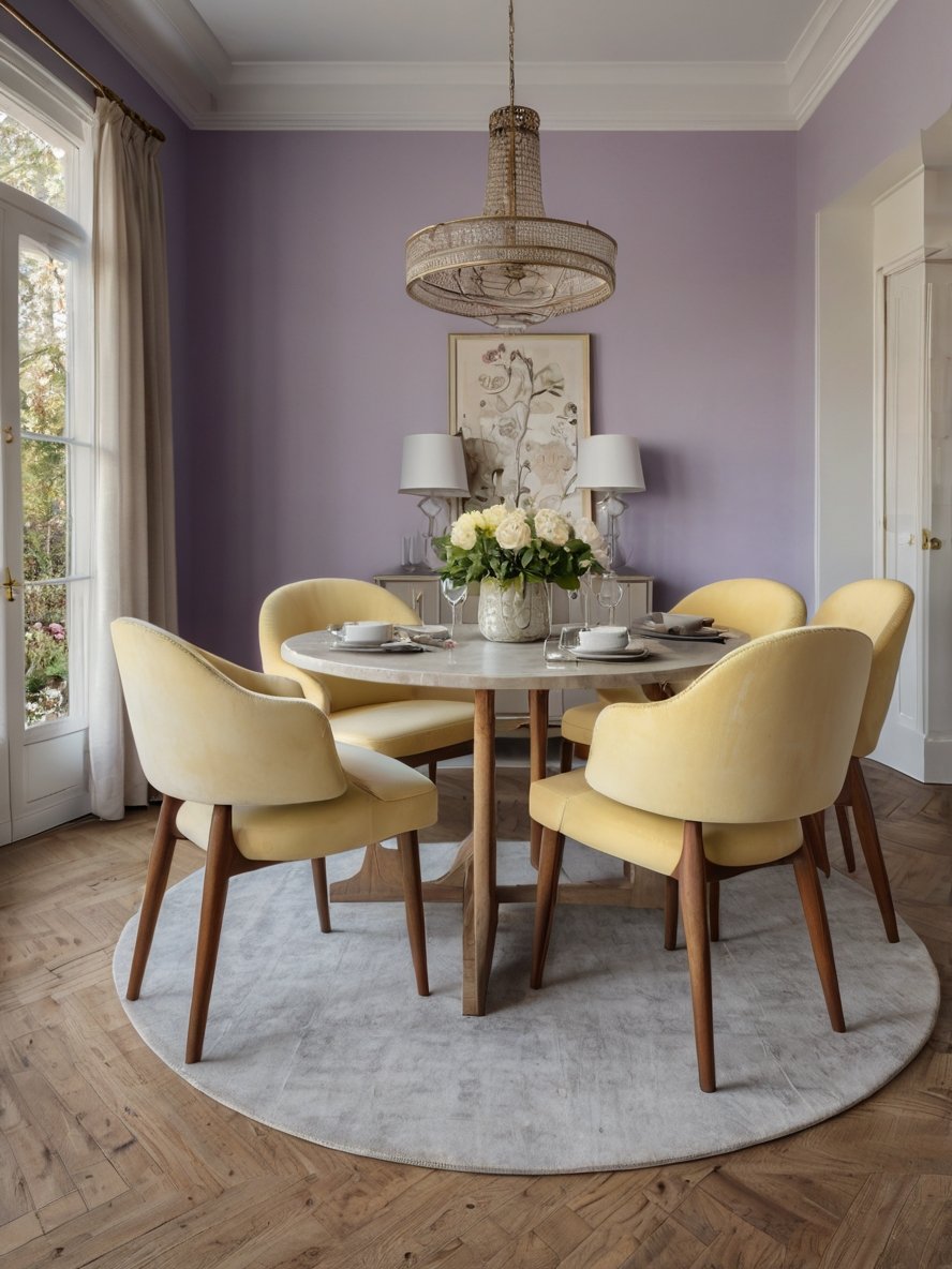 The soft lavender walls provide a calming and sophisticated backdrop, creating a dreamy and inviting atmosphere. The pale yellow upholstered chairs introduce a gentle contrast, adding warmth without overwhelming the space. This complementary color palette of cool lavender and warm yellow strikes the perfect balance, making the room feel airy yet cozy. The combination of pastels allows for a refined, luxurious look that feels timeless rather than trendy. The muted tones ensure that the space remains elegant and adaptable to different styles over time.