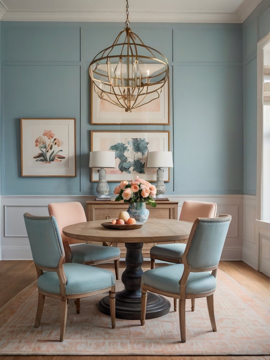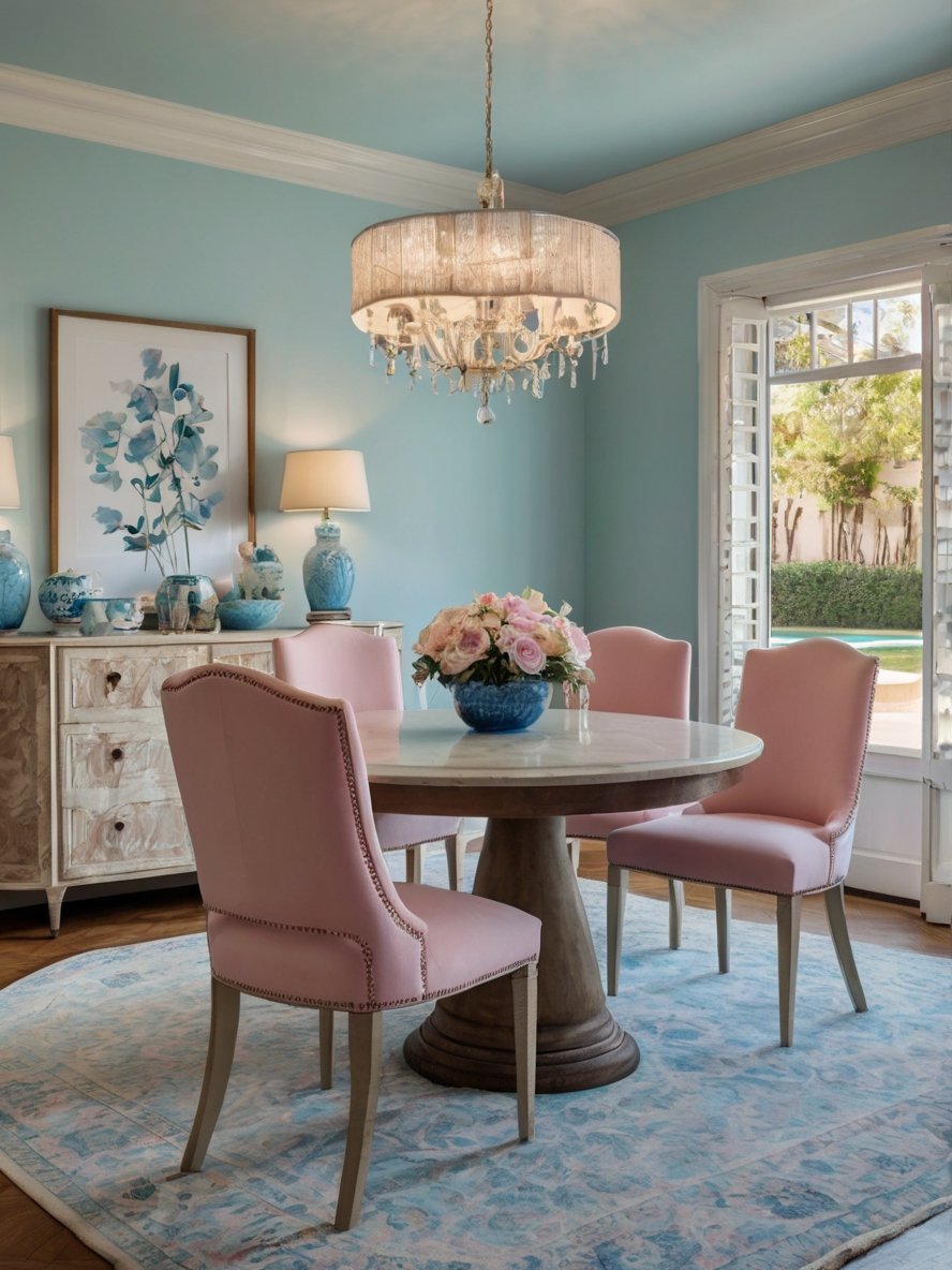 The combination of sky-blue walls and blush-pink chairs creates a serene and inviting atmosphere. The cool blue tones evoke a sense of tranquility, while the warm pink adds a touch of romance and sophistication. This pastel pairing feels balanced and fresh, making the space look bright and airy. The soft colors work together to create a visually cohesive environment, ensuring that the dining room feels both stylish and calming. The hints of cream and beige in the furniture and décor further enhance the refined yet soft aesthetic.