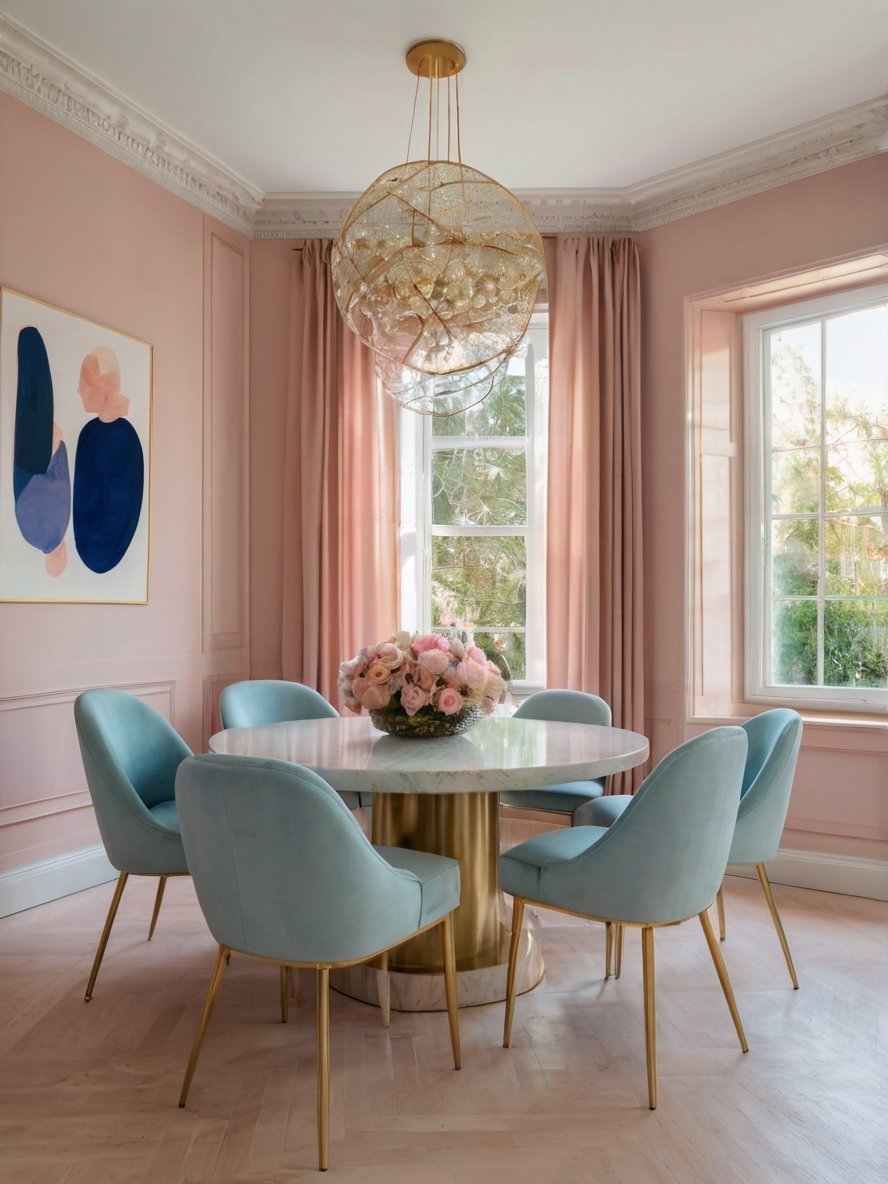 The soft pastel pink walls paired with dusty blue chairs create an effortlessly elegant and feminine ambiance. Pink, often associated with warmth and sophistication, brings a romantic touch, while the blue chairs provide a balanced contrast, preventing the space from feeling overly monochromatic. The blend of these two pastel shades gives a chic, Parisian-inspired aesthetic, perfect for a stylish dining space. The gold accents on the chair legs, pendant light, and table base add a luxurious touch, elevating the room’s overall appeal. The color choices feel intentional and well-balanced, ensuring the space remains sophisticated without appearing overly sweet or juvenile.
