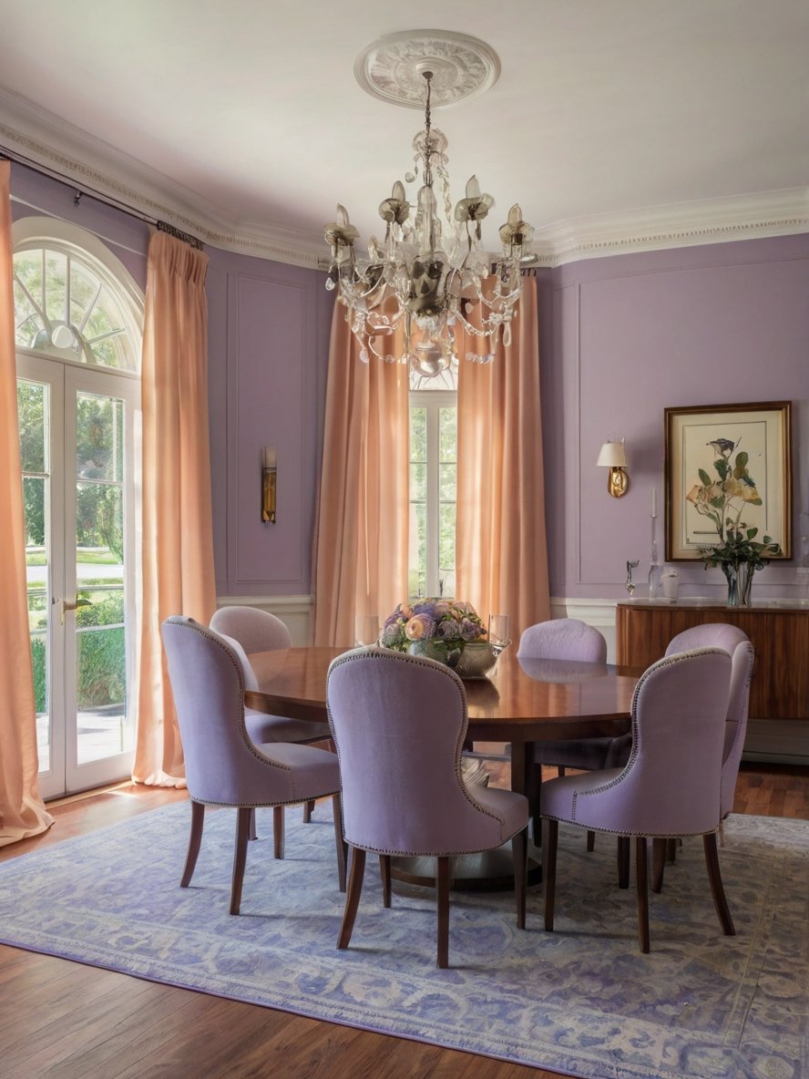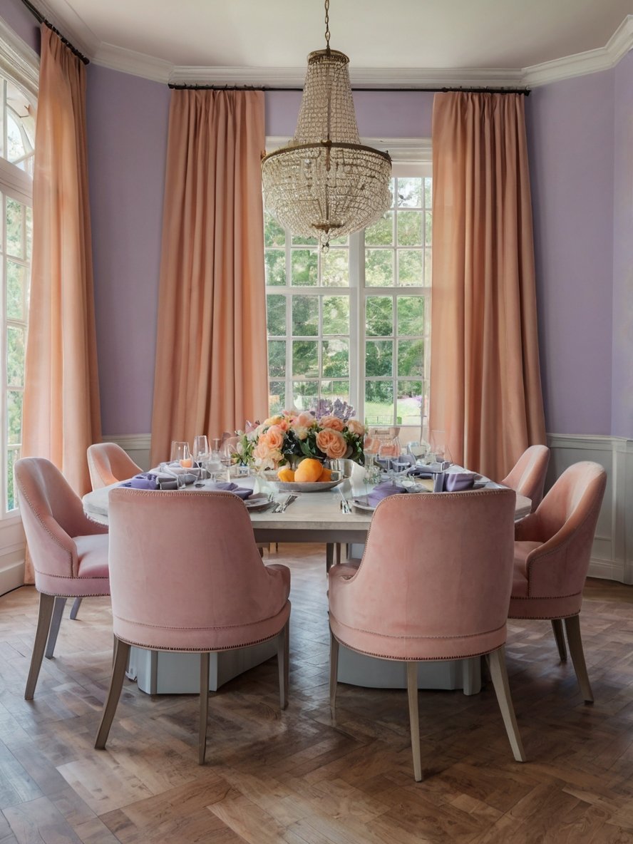 The blush pink curtains perfectly complement the pastel lavender walls, creating a harmonious and sophisticated look. The color choice adds warmth to the space, preventing the lavender from feeling too cool or distant. Blush pink exudes elegance and romance, making the dining room feel inviting and refined. This subtle contrast enhances the overall aesthetic without overpowering the delicate color scheme. The curtains act as a unifying element, connecting the soft hues of the chairs, floral arrangements, and table setting to create a cohesive and well-balanced ambiance.