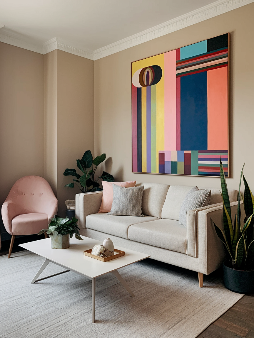 Bold, oversized artwork can give a small room a personality boost without adding clutter. A single large piece or a curated gallery wall can become the focal point of the living room. Bright colors, geometric patterns, or abstract designs inject energy and style. Art allows you to express your personal taste and create a cohesive aesthetic that feels intentional, helping the room feel unique and inviting despite limited square footage.