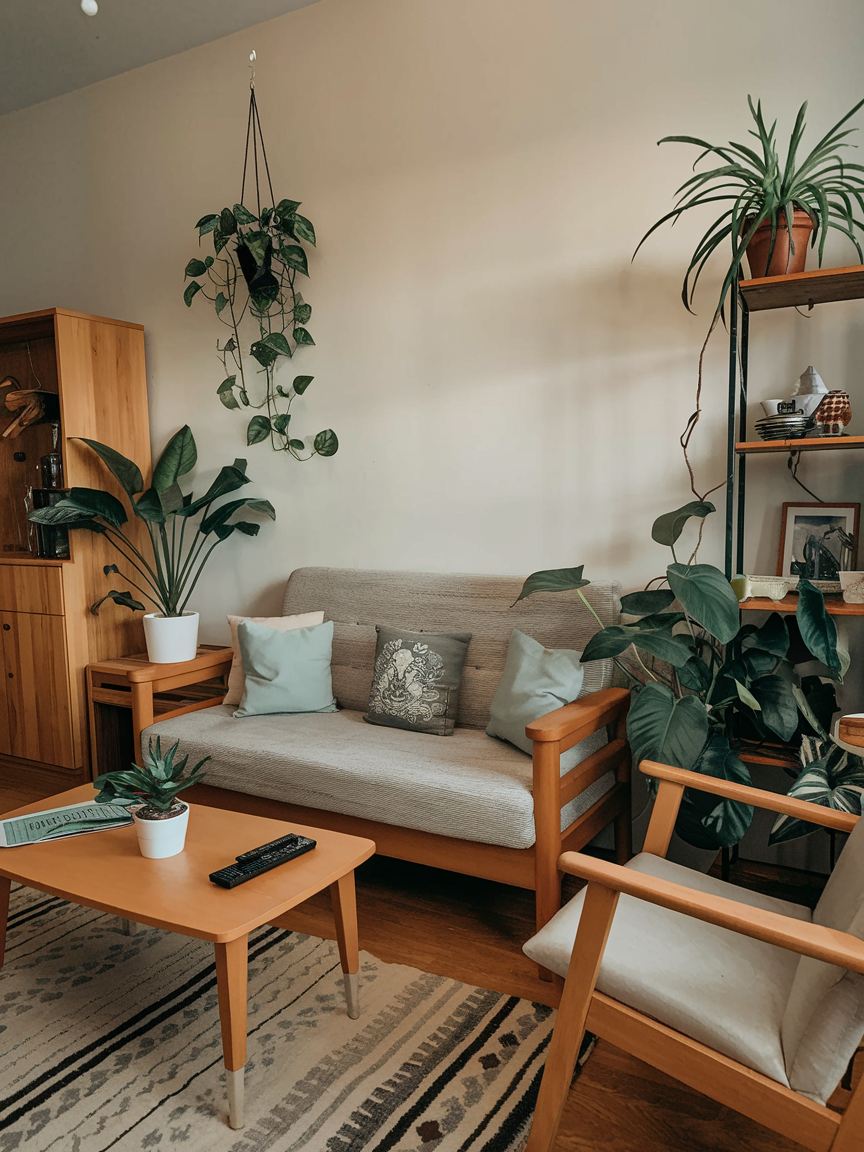 Plants bring life and color to any living room. In small apartments, they can soften edges and introduce a natural element without clutter. Hanging planters, small potted plants on shelves, or tabletop arrangements add personality and freshness. Plants improve air quality and create a calming, inviting atmosphere. Incorporating greenery makes a compact living room feel cozy, dynamic, and full of energy, giving the space both character and comfort.