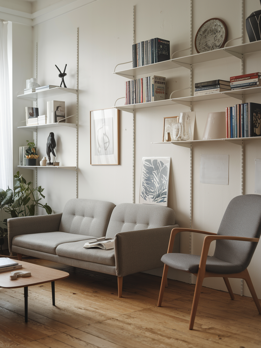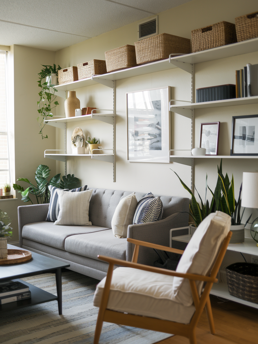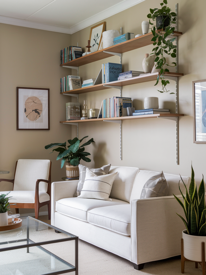 When floor space is tight, go vertical. Floating shelves are perfect for displaying books, plants, or decorative objects without taking up precious ground space. They create visual interest at eye level and make the room feel taller. You can mix open shelving with small baskets or boxes to keep clutter out of sight. A wall filled with well-curated shelves adds personality and allows you to showcase your favorite items while keeping the living area organized and functional.