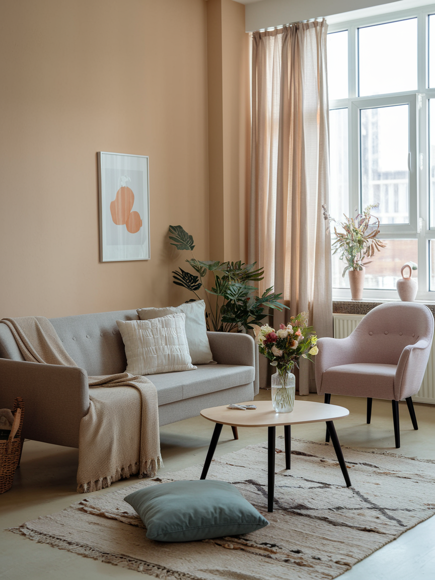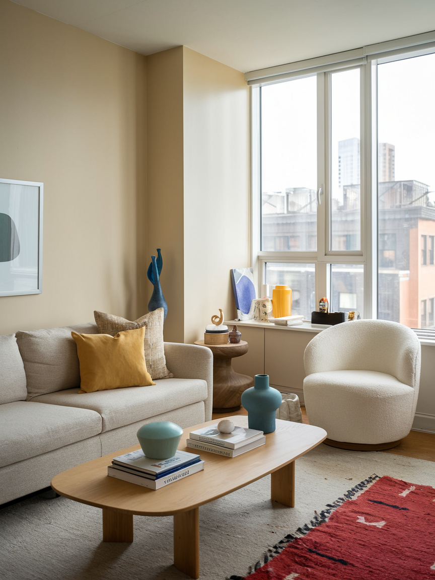 A neutral base with strategic pops of color keeps a small space from feeling flat. Throw pillows, rugs, or accent chairs in bold shades inject personality without overwhelming the room. This approach allows you to rotate seasonal colors or update your look without major renovations. Balancing calm neutrals with bright accents keeps your apartment feeling lively, cozy, and uniquely yours.