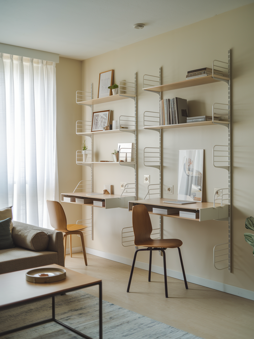 In small apartments, floating desks provide a functional workspace without taking up floor area. Mounted to the wall, these desks can double as display surfaces or additional storage when paired with shelves. They keep the room organized and uncluttered while allowing flexibility. Floating workstations are perfect for compact living rooms that need to serve multiple purposes without sacrificing style or comfort