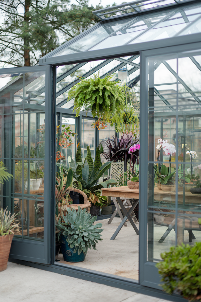 A convertible greenhouse is a versatile structure that can function as both a greenhouse and an outdoor entertainment area. With sliding glass walls or removable panels, this design allows you to open up the space completely during warm months and seal it off during colder seasons. This setup is perfect for those who want a functional greenhouse that can also serve as a sunroom, dining area, or garden lounge. Furnishing the space with comfortable seating, string lights, and a small coffee table makes it a cozy retreat that can be enjoyed all year long.