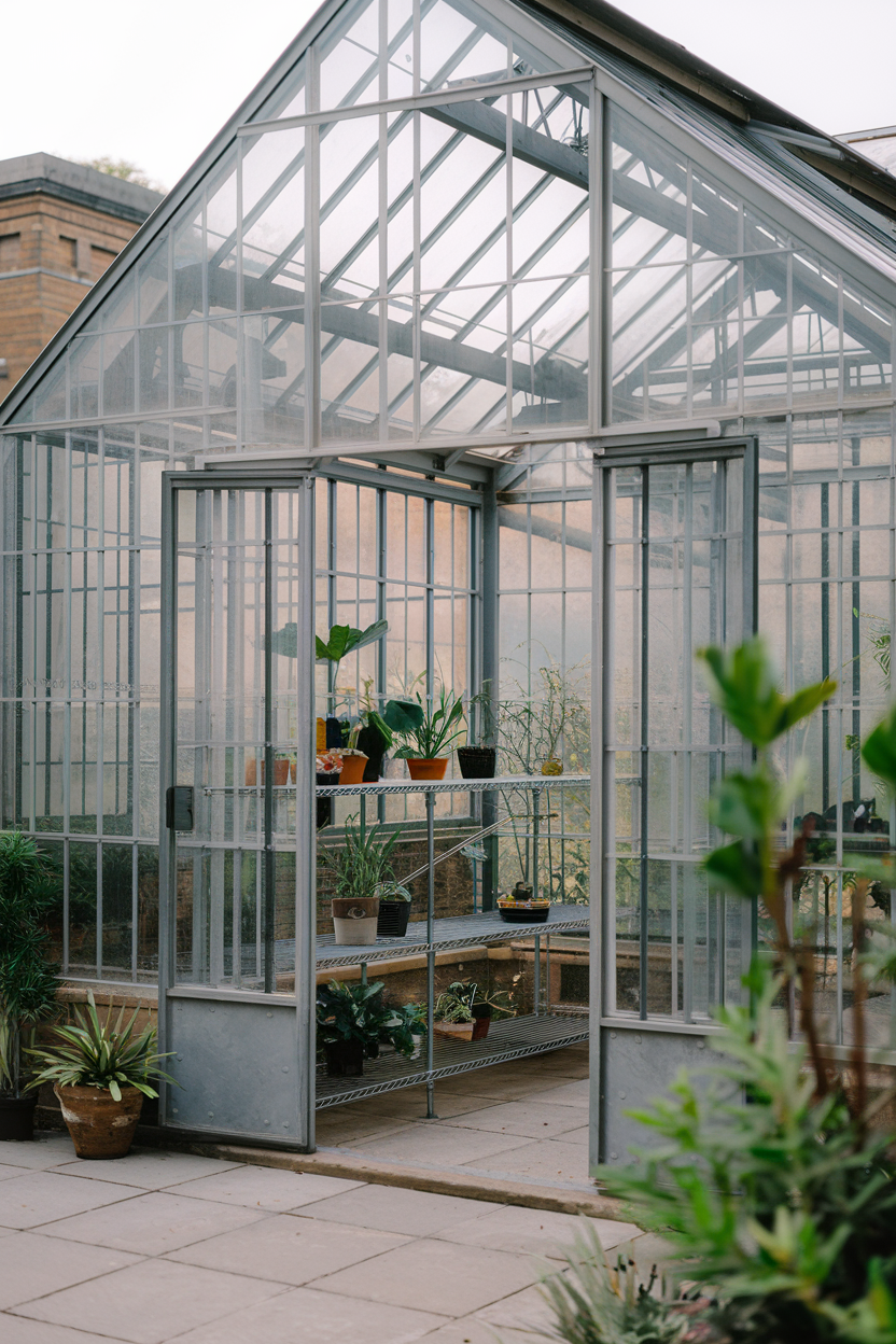 An industrial-style greenhouse, featuring steel or iron frames and large glass panels, adds a sleek and modern touch to any garden. This style is both durable and low-maintenance, making it an excellent long-term investment. The strong metal framework ensures stability against harsh weather, while the glass panels allow for maximum light exposure. To complement the industrial aesthetic, incorporate metal shelving, minimalist planters, and functional LED grow lights for a stylish yet practical greenhouse setup.