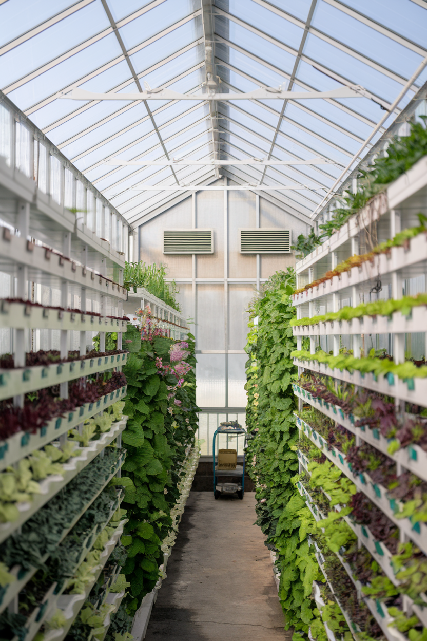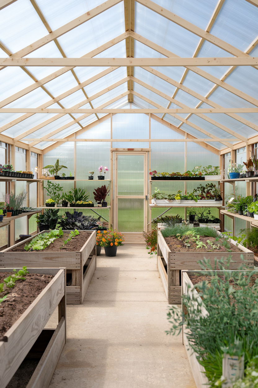 A multi-level greenhouse optimizes space by incorporating tiered planting areas, hanging planters, and vertical shelving units. This setup allows you to grow a wide variety of plants without requiring a large footprint, making it ideal for urban gardeners or those with limited yard space. Using trellises, wall-mounted planters, or stacked hydroponic systems increases plant diversity while creating an organized and visually appealing greenhouse. This design works well for growing vine crops, herbs, and decorative plants in a compact yet productive space.