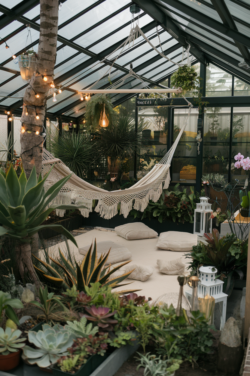 Transform your greenhouse into a dual-purpose space by incorporating a seating or relaxation area. A cozy bench, small table, or hammock can turn your greenhouse into a peaceful retreat where you can enjoy the beauty of your plants while sipping tea or reading a book. Adding decorative elements like fairy lights, lanterns, and soft cushions enhances the ambiance, making your greenhouse a serene escape from the daily hustle. This multifunctional approach blends gardening with relaxation, offering a tranquil sanctuary within your own backyard.