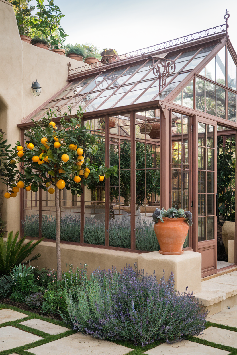 A Mediterranean-style greenhouse exudes warmth and charm, combining stucco walls, terracotta pots, and wrought iron details with an abundance of citrus trees, lavender, and olive plants. The design incorporates large windows for maximum sunlight exposure, while rustic wooden beams and stone flooring add an old-world aesthetic. This type of greenhouse is ideal for growing warm-weather crops and drought-resistant plants, offering a stunning yet functional retreat reminiscent of a Tuscan villa.