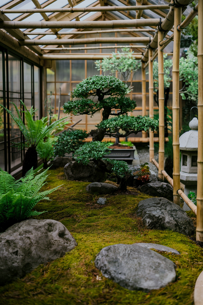 A Japanese Zen greenhouse emphasizes harmony, simplicity, and natural beauty. Featuring clean lines, bamboo accents, and a rock garden, this design creates a serene space for both plants and people. A minimalist approach to decor, combined with a carefully curated selection of bonsai trees, moss, and ferns, fosters a sense of balance and relaxation. Adding a small tea corner or meditation area within the greenhouse enhances the calming atmosphere, making it a perfect retreat for stress relief.