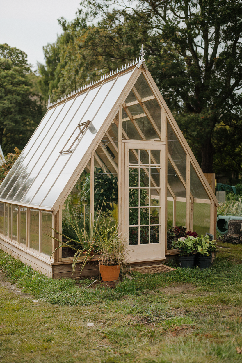 For a greenhouse that blends seamlessly with nature, a rustic wooden greenhouse is a charming choice. Using reclaimed wood or natural timber creates a cozy, cottage-like aesthetic that enhances your garden’s overall appeal. The wooden framework provides excellent insulation, and when paired with glass or polycarbonate panels, it offers a sturdy and stylish growing environment. Adding climbing vines or decorative hanging planters will enhance the rustic charm, making your greenhouse a beautiful and functional focal point in your garden.