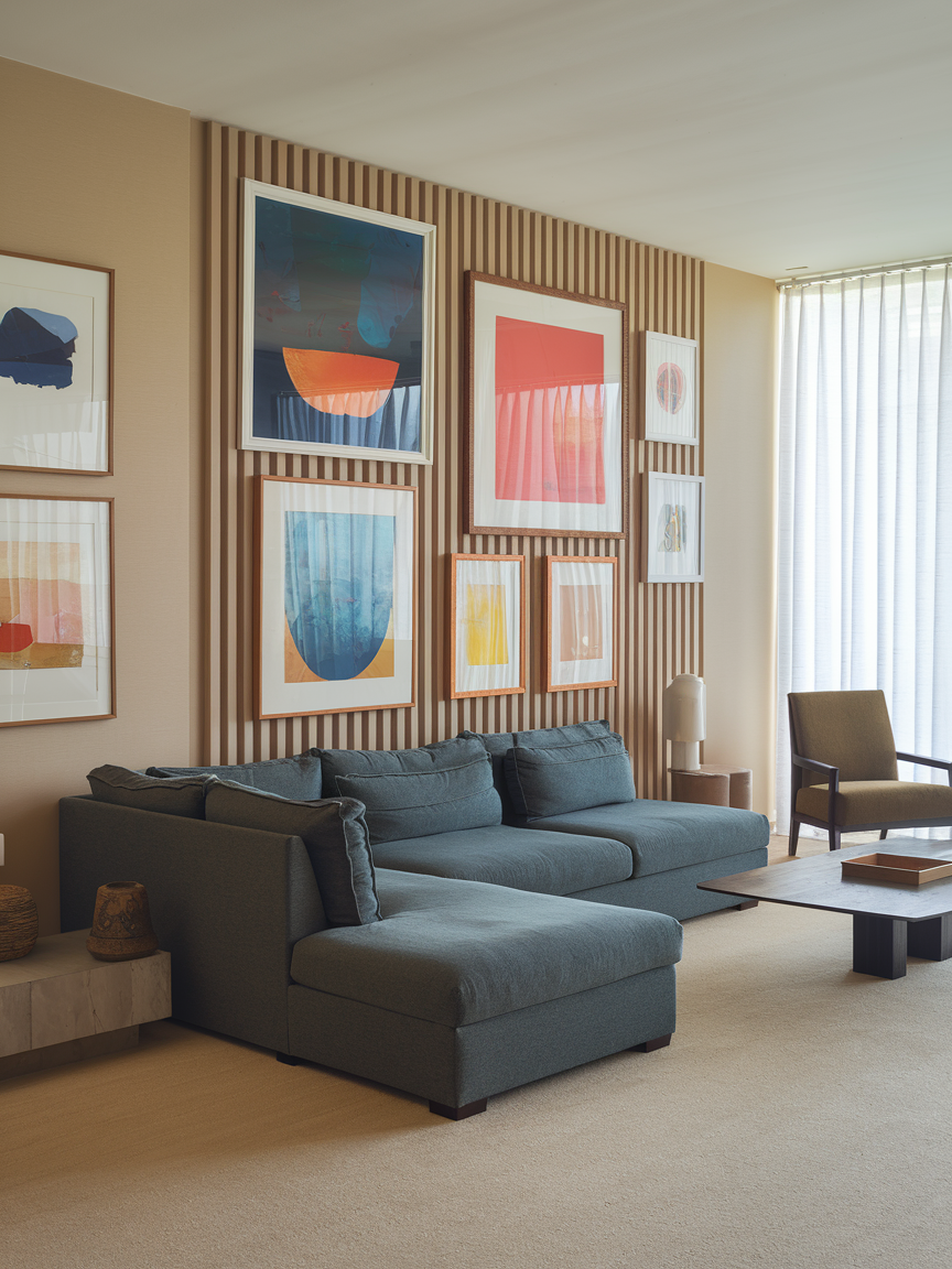 A vertical gallery arrangement is a clever way to emphasize height within a living room. Instead of spreading artwork horizontally, stacking pieces vertically draws the eye upward. This elongates the wall visually and helps ceilings appear taller. Carefully chosen frames in similar tones create a cohesive display that feels curated rather than cluttered. A vertical gallery wall adds personality and creativity while maintaining the illusion of expanded space.