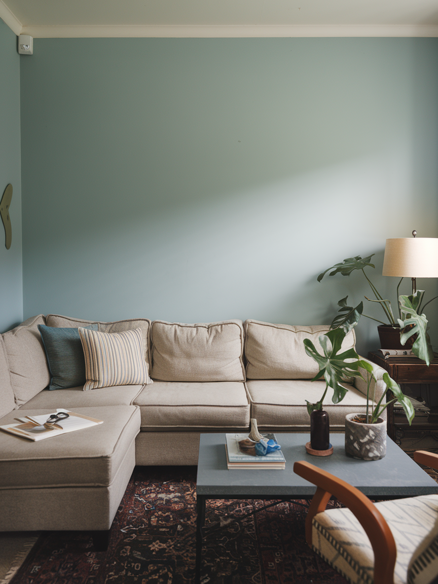 Accent walls can add depth and dimension when used thoughtfully. In a smaller living room, a gentle accent shade, such as muted sage, dusty blue, or soft gray, creates visual layering without overwhelming the room. This subtle contrast adds interest while keeping the space calm and balanced. When the accent wall highlights a focal point like a sofa or fireplace, it anchors the design while still maintaining openness.