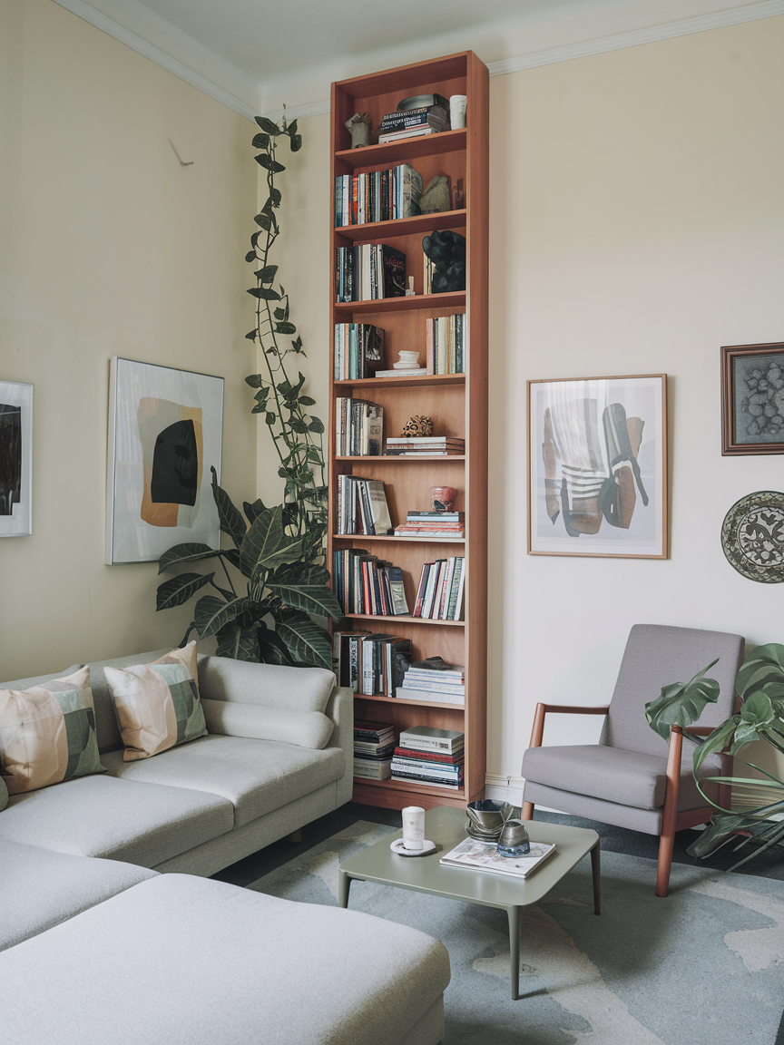 Tall bookcases make excellent use of vertical space while keeping the floor uncluttered. By drawing attention upward, they emphasize the height of the room and make the ceilings feel higher. Open shelving designs are particularly effective because they maintain a light visual presence. When styled with books, plants, and decorative objects, tall shelves provide both storage and visual interest while helping the room feel organized and expansive.