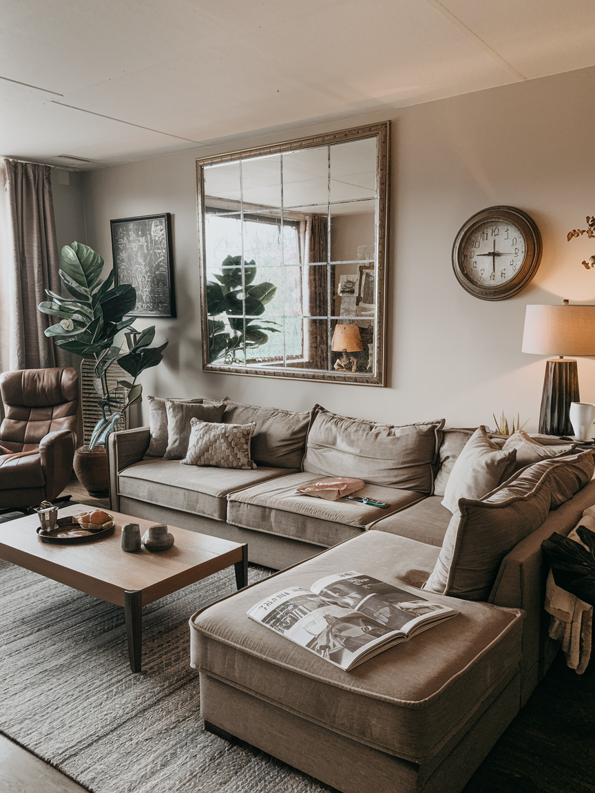 A large mirror is one of the simplest and most effective ways to visually expand a living room. Mirrors reflect both natural and artificial light, instantly brightening the space and giving the illusion of greater depth. When placed across from a window or near a light source, they amplify brightness and make the room feel more open and airy. Choose a sleek frame or frameless design to maintain a clean aesthetic that doesn’t overwhelm the wall. An oversized mirror can also act as a striking focal point while quietly enhancing the sense of spaciousness.