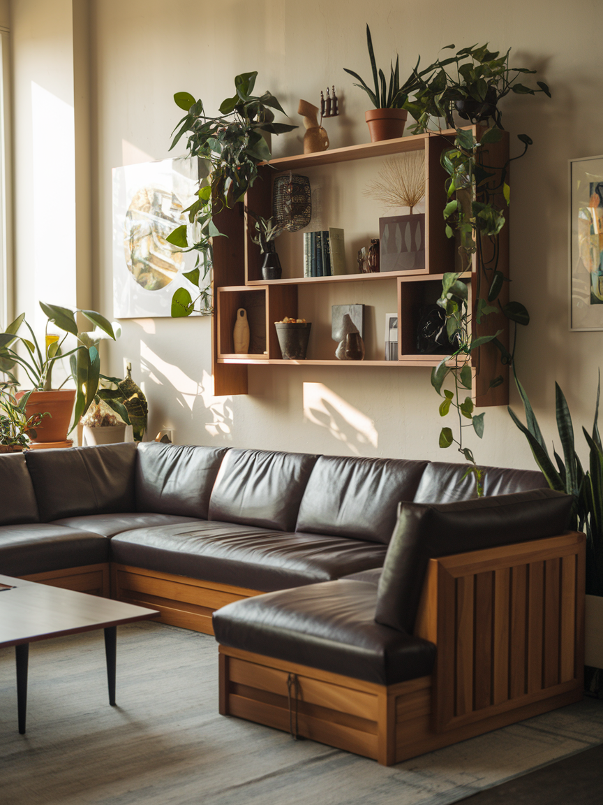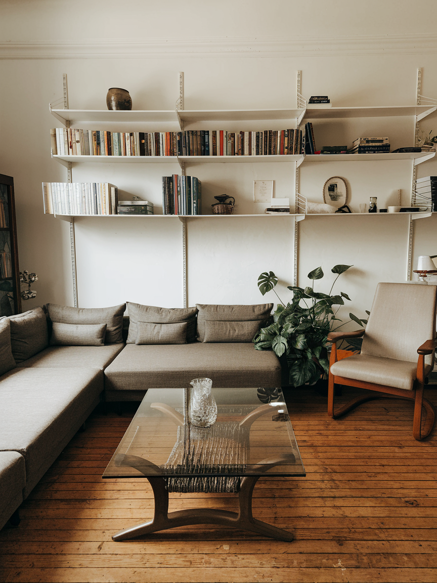 Open shelving keeps walls functional without making the room feel heavy. Unlike closed cabinets, open shelves allow the eye to see through the space, which creates a lighter visual effect. Displaying books, plants, or curated decorative pieces adds personality while maintaining organization. The key is to keep the arrangement balanced and uncluttered so the shelves enhance the room’s openness rather than overwhelm it.