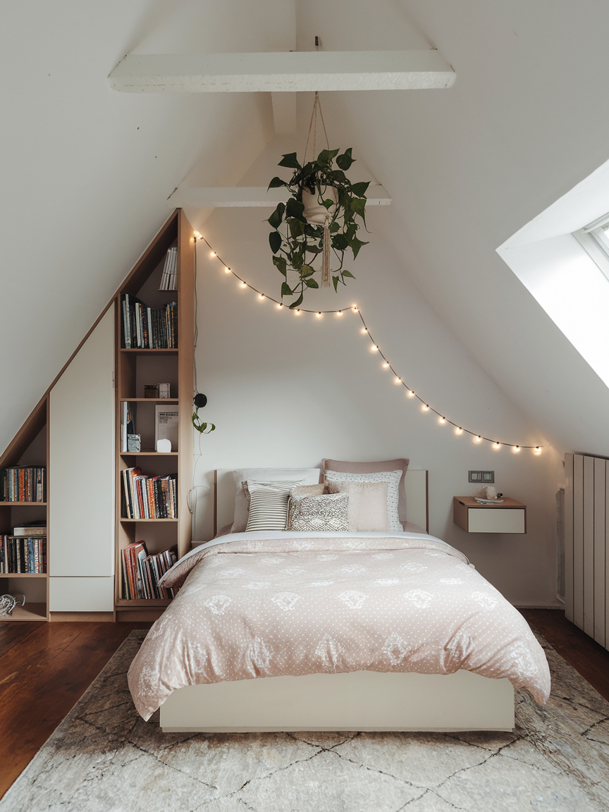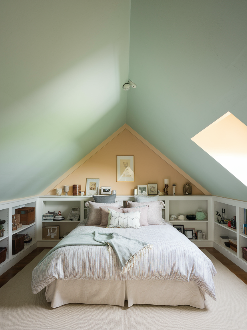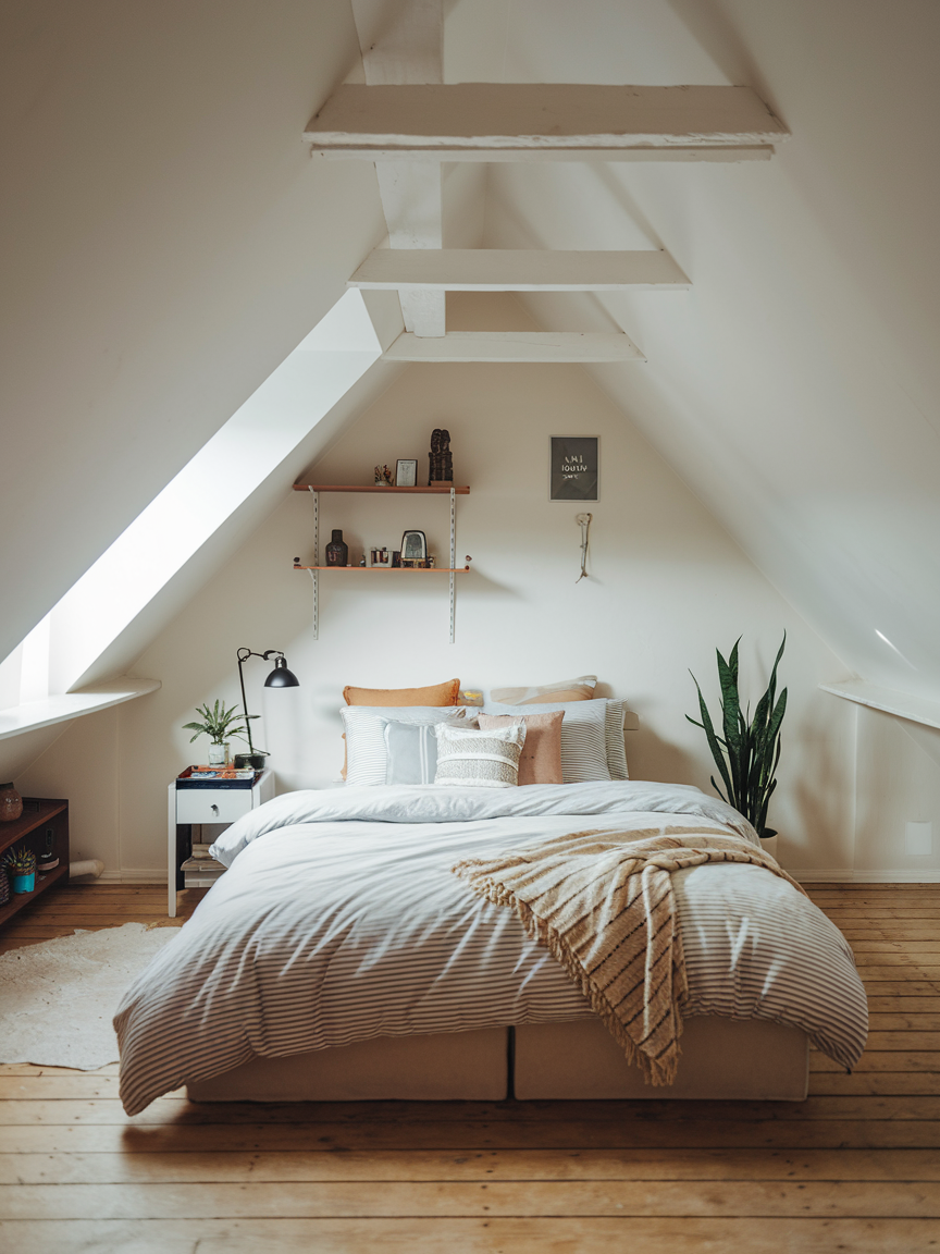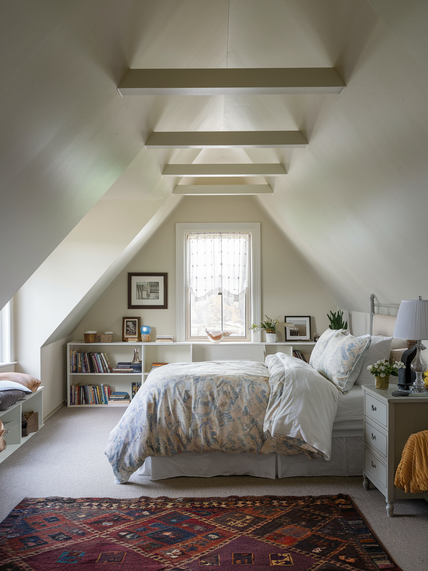 Sloped ceilings can be intimidating, but they actually give your attic bedroom character and charm. Highlight the angles instead of hiding them by painting the ceiling a soft, light color to create the illusion of more space. You can also incorporate built-in shelving or storage under the lower sections to make the room practical without crowding it. Embracing the natural architecture turns what could be a challenge into a design feature, giving your loft bedroom that unique, cozy appeal that no regular bedroom can match.