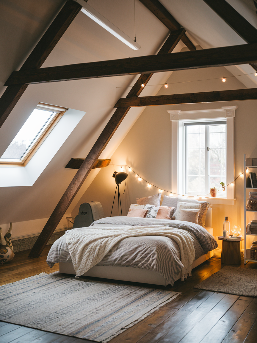 Lighting plays a huge role in creating a dreamy loft vibe. Besides skylights, use ambient lighting such as floor lamps, table lamps, string lights, or wall sconces to create warmth. Soft, layered lighting enhances the cozy atmosphere and makes your attic bedroom feel welcoming in the evening. You can also highlight architectural details like beams or angled walls with subtle LED strips. Thoughtful lighting turns the attic into a magical retreat that feels relaxing, intimate, and perfect for lounging, reading, or just unwinding after a long day.