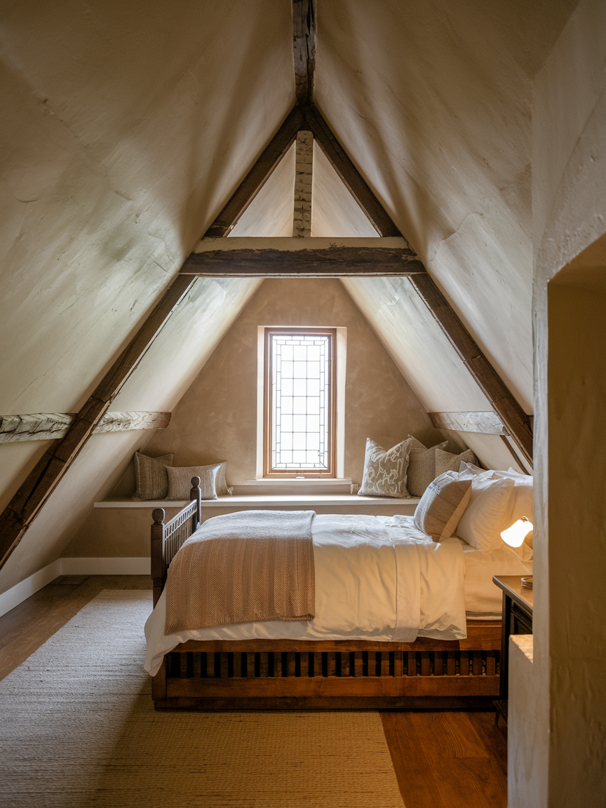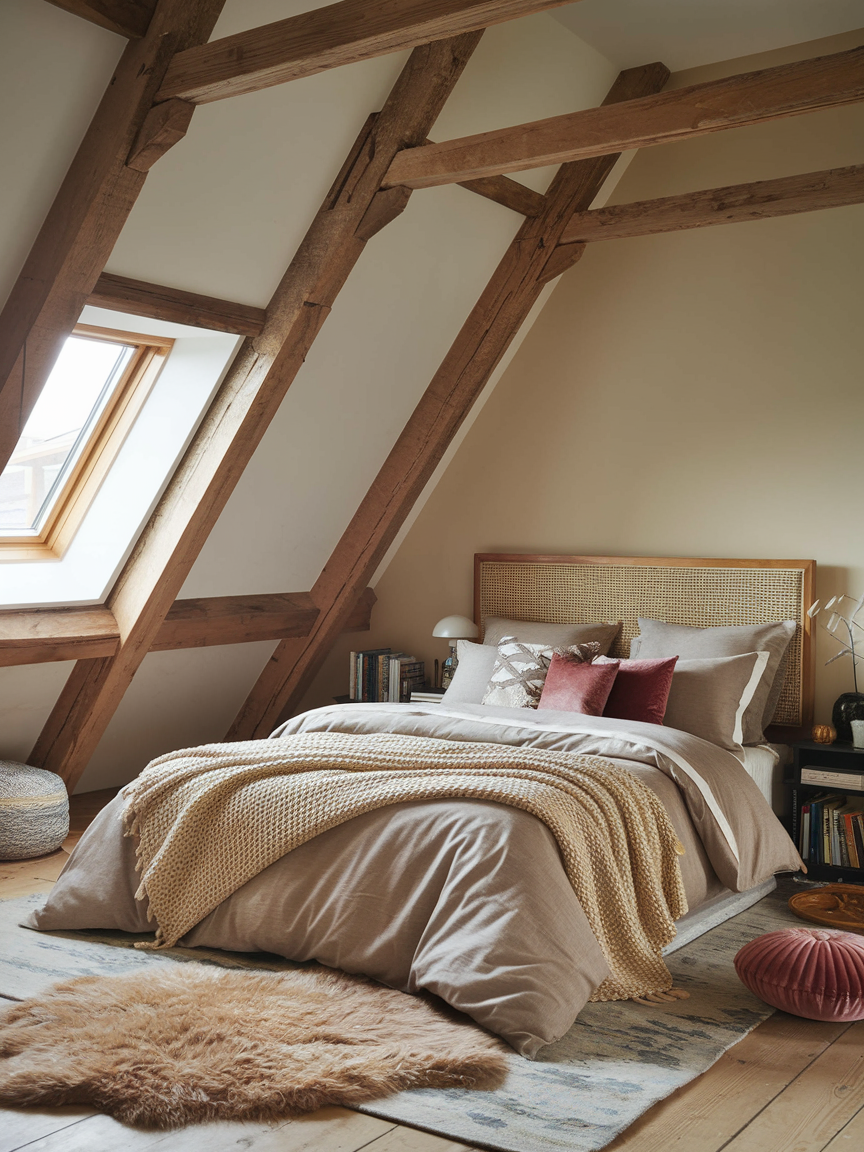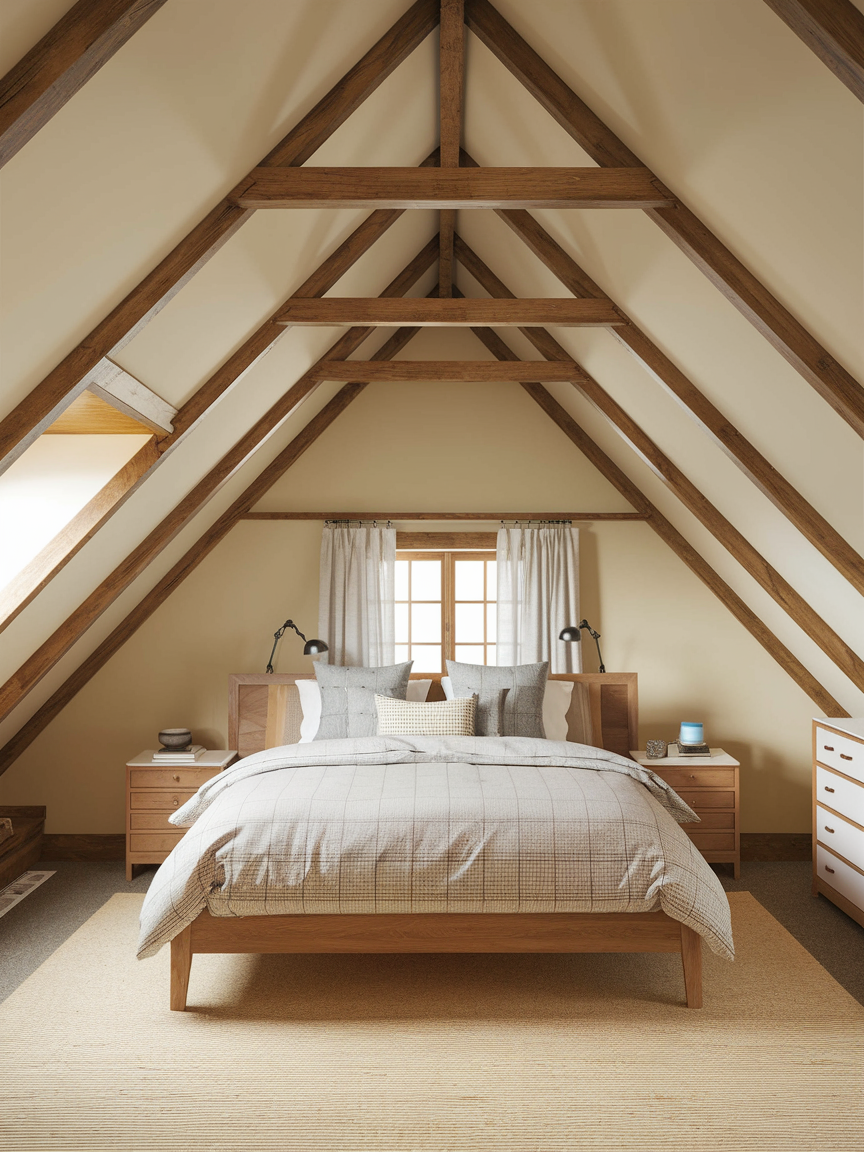 Wood elements add warmth and texture to attic bedrooms. Think hardwood floors, wooden beams, or a wooden bed frame. Natural wood tones contrast beautifully with light walls and soft fabrics, creating a cozy, inviting atmosphere. Using wood strategically ensures the loft feels organic and grounded, adding depth without cluttering the space. It’s an easy way to make your attic bedroom feel timeless, welcoming, and effortlessly stylish while enhancing the cozy, hideaway vibe that makes lofts so appealing.
