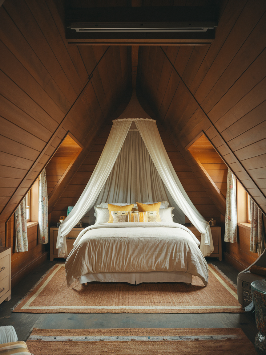 Draped fabrics or a canopy bed add softness and elegance to attic bedrooms. Light, flowing fabrics can create a dreamy, intimate feel, enhancing the loft’s cozy charm. Canopies or sheer curtains around the bed define the sleeping area and add a touch of romance without taking up space. This design choice elevates the attic bedroom from simple to whimsical while maintaining its airy and serene atmosphere. Fabrics also provide opportunities to introduce subtle color or texture, further enhancing the hideaway vibe.
