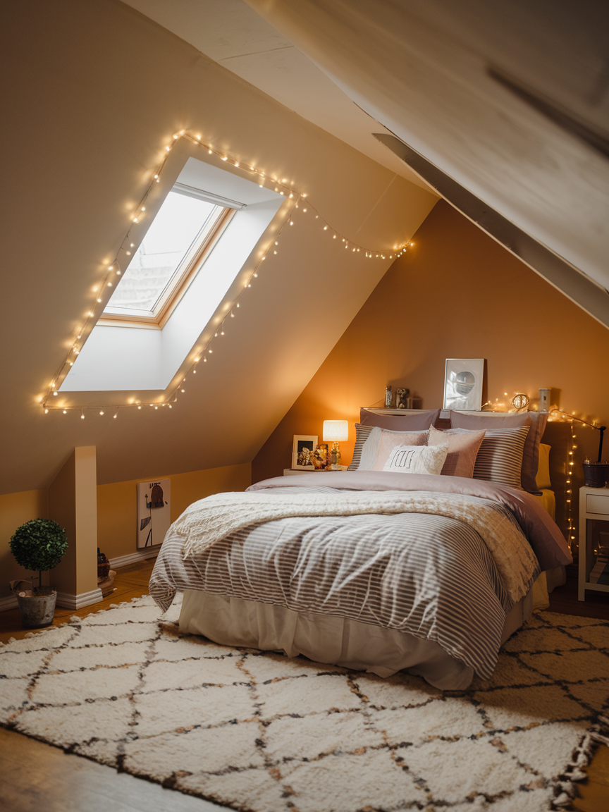 String lights, LED strips, or small table lamps can enhance the dreamy atmosphere of your attic bedroom. Subtle lighting accents create warmth and intimacy, complementing natural light from windows or skylights. They help define areas, highlight architectural features, and make the loft feel cozy in the evening. Lighting is an essential design element in attics, turning ordinary spaces into magical hideaways. By layering light sources, you maintain functionality while reinforcing the warm, inviting character of your loft retreat.