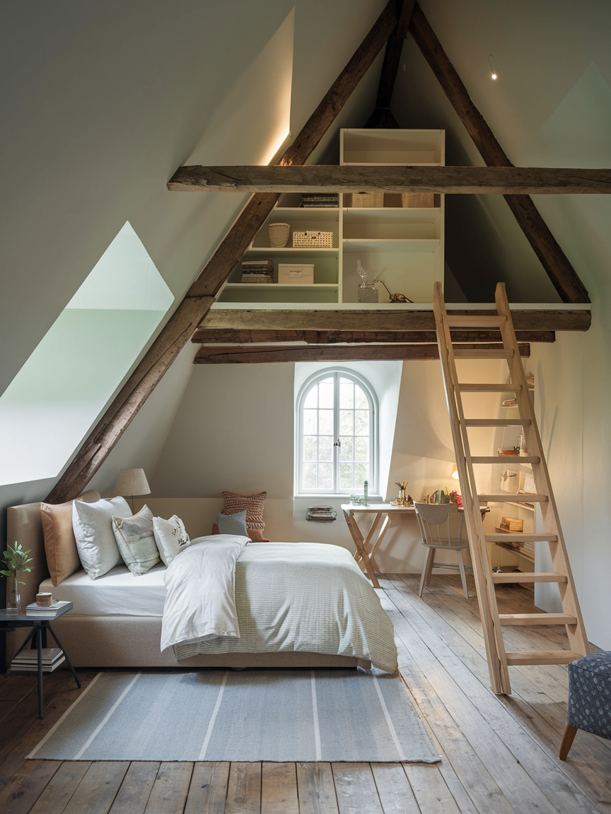 Soft furnishings like throws, cushions, rugs, and blankets personalize the loft bedroom while adding comfort. Mixing textures and patterns in muted tones enhances the cozy, dreamy feel without creating clutter. Soft furnishings also make the space inviting, encouraging relaxation and lounging. They allow you to experiment with style in a low-commitment way, perfect for a space that is both private and personal. Thoughtful choices in fabrics and textures complete the attic hideaway, turning it into the dreamy retreat you have always wanted.