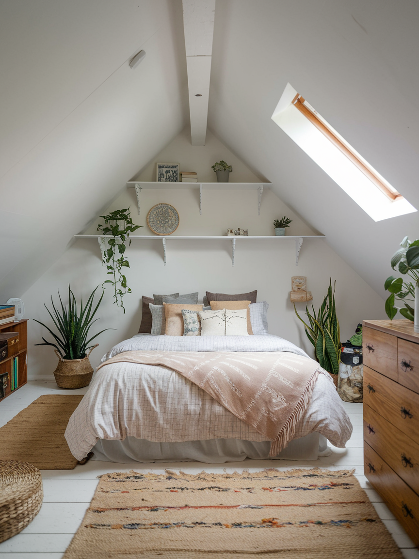 Adding natural elements like plants, wooden furniture, or woven baskets brings life to an attic bedroom. Natural textures soften hard architectural lines and create a cozy, organic vibe. Plants also improve air quality and add a touch of color and vibrancy. These elements make the loft feel more connected to nature, enhancing relaxation and comfort. Incorporating nature-inspired décor ensures that your attic bedroom is not just visually appealing but also soothing and welcoming—a true retreat from everyday life.