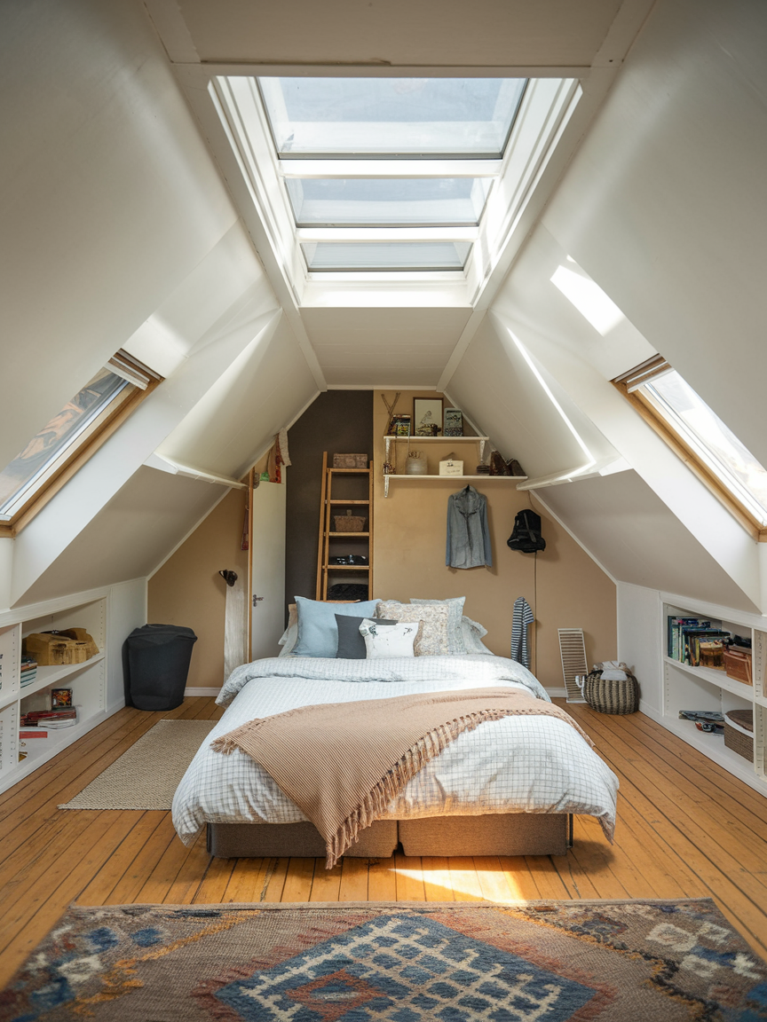 Skylights are a game-changer in attic bedrooms because they bring in abundant natural light that standard windows often cannot provide. Installing one or two skylights brightens the space, making it feel more spacious and airy. You can also enjoy the morning sun or a starlit sky at night from the comfort of your bed. Skylights create an almost magical atmosphere, and with the addition of blinds or shades, you can control the light and privacy. They’re perfect for turning an attic into a dreamy, well-lit hideaway.