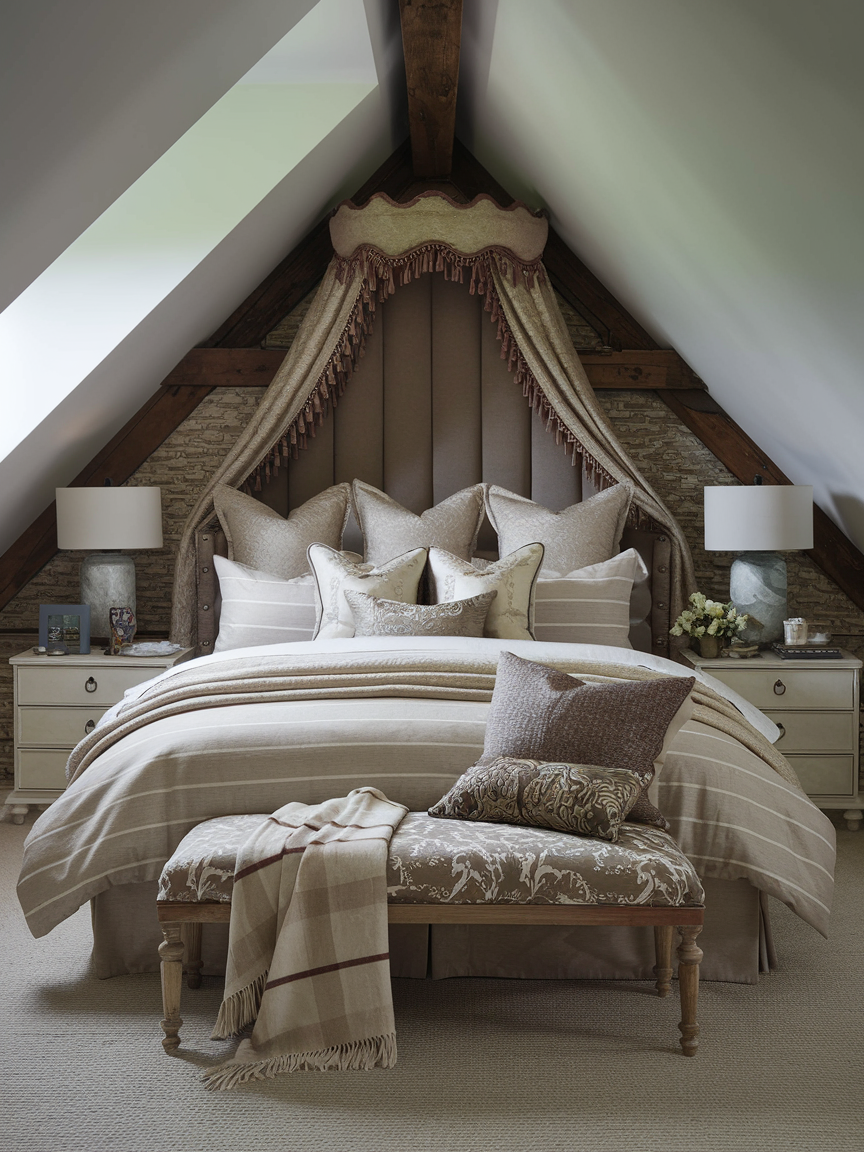 The bed is the centerpiece of any bedroom, and in a loft, it becomes even more important. Choose a statement bed with an interesting headboard, unique frame, or luxurious bedding to anchor the space. Layer with pillows, throws, and textures to enhance the cozy factor. In an attic, your bed doesn’t need to be enormous; even a modest-sized bed can feel inviting if styled intentionally. A beautiful bed instantly elevates the entire room, creating a dreamy retreat that encourages relaxation and makes the loft feel like a true hideaway.