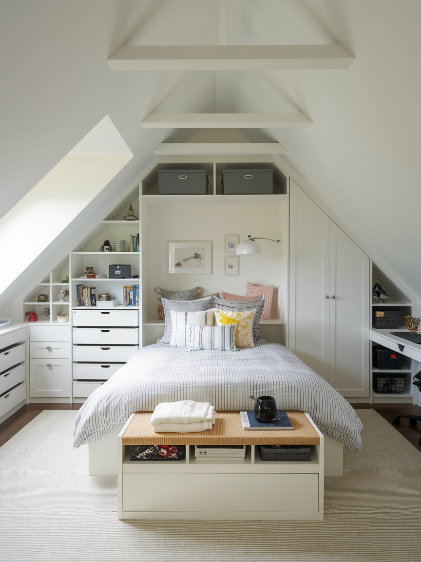 When floor space is limited, lofted storage solutions take advantage of height without cluttering the room. High shelves, under-eaves cabinets, or overhead racks keep items organized while preserving the open feel. Lofted storage is perfect for seasonal items, extra bedding, or rarely used belongings, ensuring the attic bedroom remains uncluttered and serene. Clever storage keeps the space functional while maintaining its dreamy, airy aesthetic, making your loft hideaway both practical and inviting.