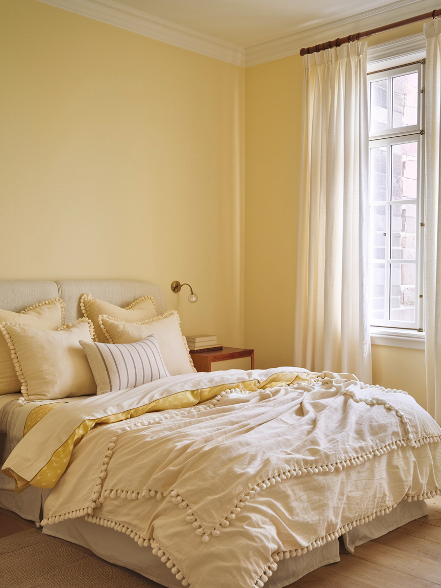 Soft yellow walls offer a gentle way to introduce color without overwhelming the space. Pale, creamy tones reflect natural light beautifully, instantly making the bedroom feel brighter and more expansive. This approach is especially effective in smaller rooms or spaces with limited sunlight. When paired with neutral furnishings like white linens or light wood accents, the look feels calm, balanced, and timeless. The subtle warmth of soft yellow creates a soothing atmosphere that still feels uplifting, making it ideal for everyday comfort.