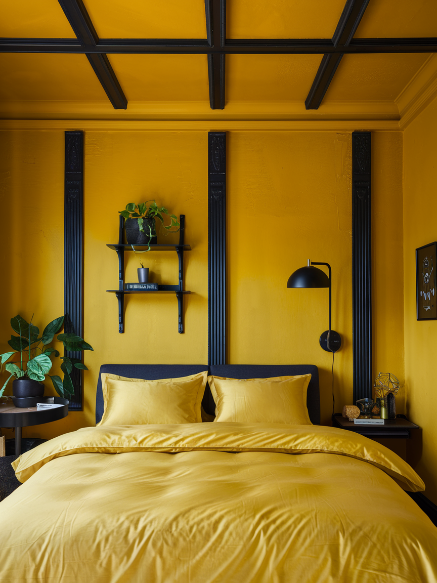 Introducing black accents into a yellow bedroom adds a sense of structure, contrast, and modern sophistication. Elements such as black-framed mirrors, lighting fixtures, bed frames, or decorative accessories create sharp definition against the warmth of yellow. This contrast prevents the room from feeling too soft or overly monochromatic, giving it a more dynamic and polished appearance. Yellow, in turn, softens the intensity of black, ensuring the overall atmosphere remains warm and inviting rather than stark. This combination is particularly effective in modern, industrial, or minimalist interiors where clean lines and bold contrasts are key. When used thoughtfully, black accents elevate the design, creating a bedroom that feels confident, balanced, and visually striking.