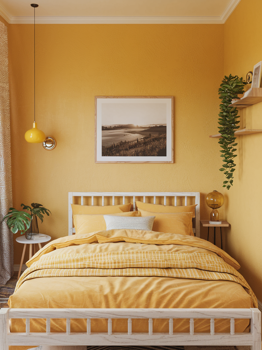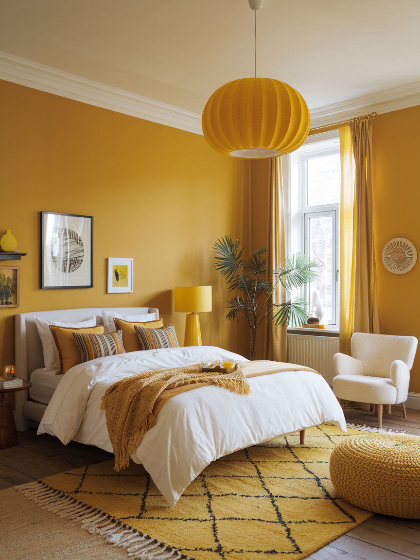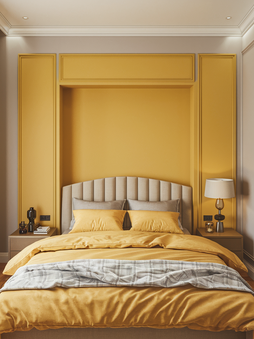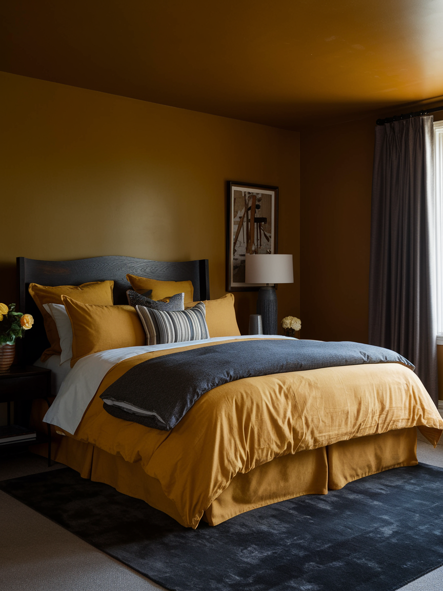 Mustard yellow offers a deeper, more refined take on this cheerful color. Its warm, earthy tone adds richness and depth, making it perfect for creating a cozy yet elevated bedroom. Paired with darker elements like charcoal grey, black accents, or deep wood finishes, mustard feels mature and stylish. Soft lighting enhances its warmth, creating an intimate atmosphere that feels both comforting and sophisticated.