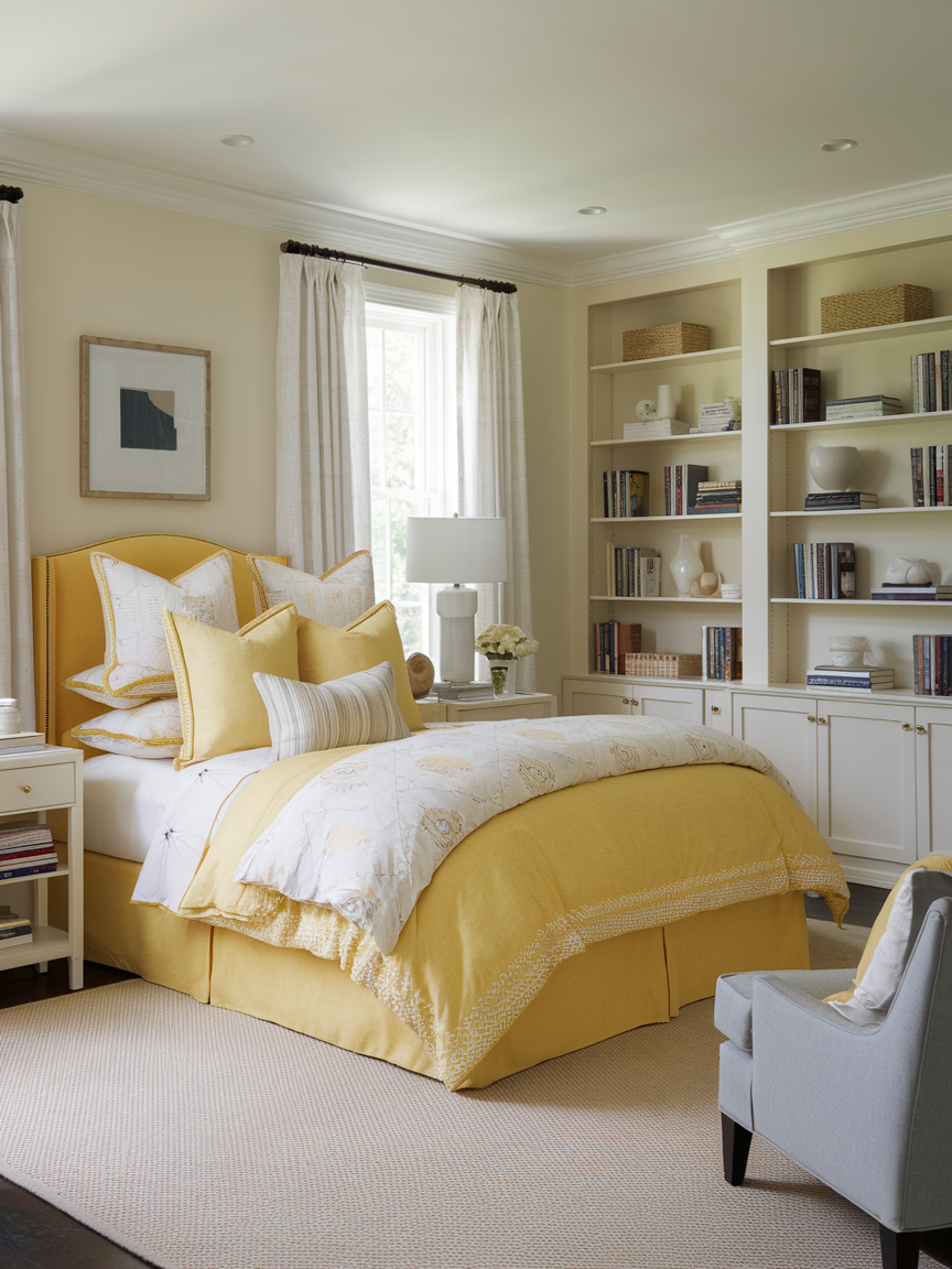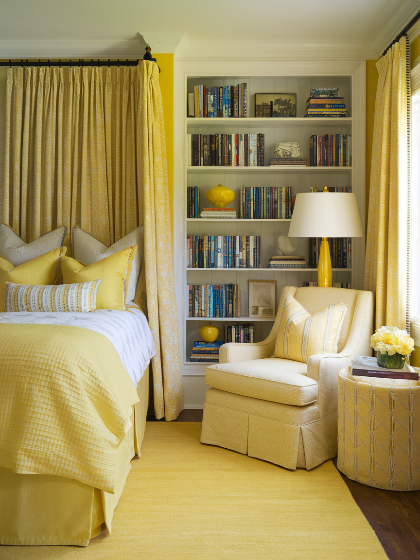 A dedicated reading corner adds both functionality and charm to a yellow bedroom, creating a personal retreat within the space. Comfortable seating, such as an upholstered chair or chaise, paired with soft throws and pillows, encourages relaxation. Warm lighting from a floor or table lamp enhances the cozy atmosphere, making the corner ideal for unwinding. Yellow tones contribute to the inviting feel, creating a space that feels cheerful yet soothing. Positioning the nook near a window can further enhance the experience with natural light. This addition transforms the bedroom into a multi-functional space that supports both rest and quiet enjoyment.