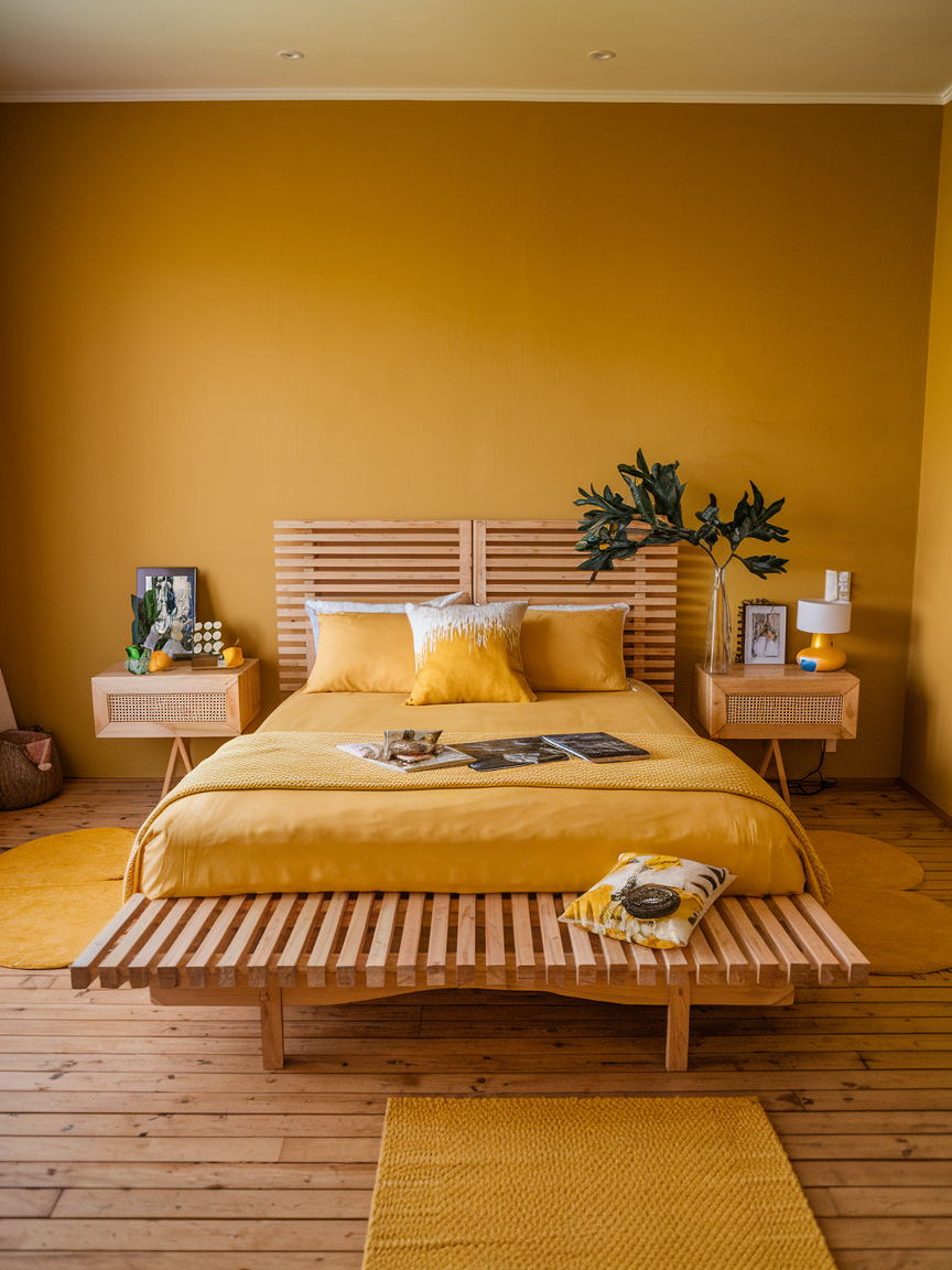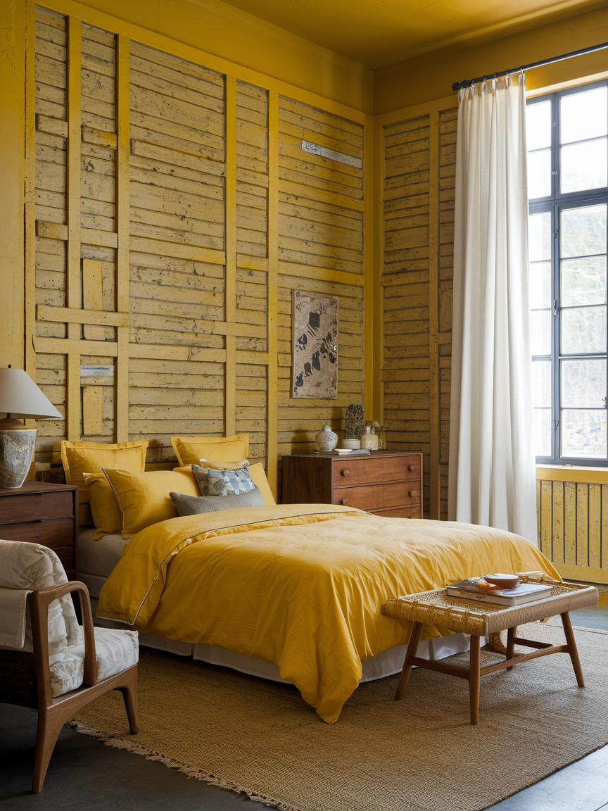 Combining yellow with natural wood elements creates a beautifully grounded and harmonious bedroom that feels both inviting and effortlessly stylish. The warmth of wood—whether through bed frames, nightstands, flooring, or ceiling beams—acts as a natural counterbalance to yellow’s brightness, preventing the space from feeling too intense or overly vibrant. Light oak, walnut, or reclaimed wood each brings its own character, adding depth and subtle variation to the design. This pairing works especially well in Scandinavian, rustic, or bohemian interiors where texture and authenticity are key. Layering in soft textiles like linen bedding or woven rugs further enhances the cozy atmosphere, creating a space that feels connected to nature. The result is a bedroom that is warm, calming, and timeless, with a perfect blend of color and organic texture.