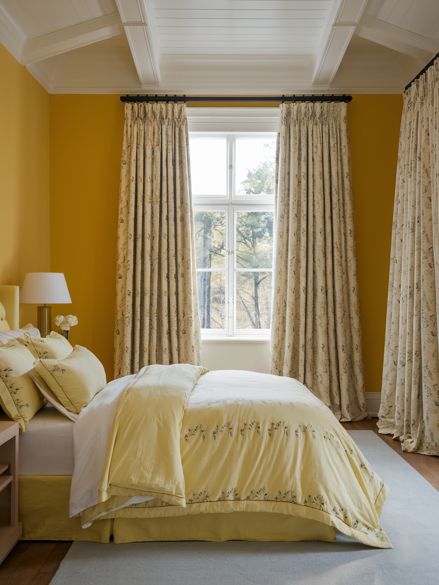 Soft curtains play an important role in shaping the ambiance of a yellow bedroom. Materials like linen, cotton, or sheer fabrics gently filter natural light, creating a warm, diffused glow that enhances the room’s softness. Light-colored curtains complement yellow tones while adding vertical texture and elegance. They also provide practical benefits such as privacy and light control. When chosen thoughtfully, curtains contribute to a serene and comfortable environment that feels both functional and refined.