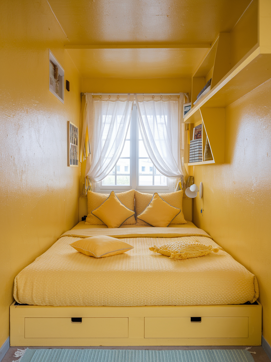 Yellow is particularly effective in small bedrooms due to its ability to reflect light and create a sense of openness. Lighter shades make compact spaces feel larger and more breathable, especially when paired with minimal furniture and clutter-free layouts. Mirrors, light textiles, and streamlined decor amplify this effect. Rather than overwhelming a small room, yellow adds personality while maintaining clarity and brightness. This makes it an excellent choice for apartments, guest rooms, or cozy spaces.