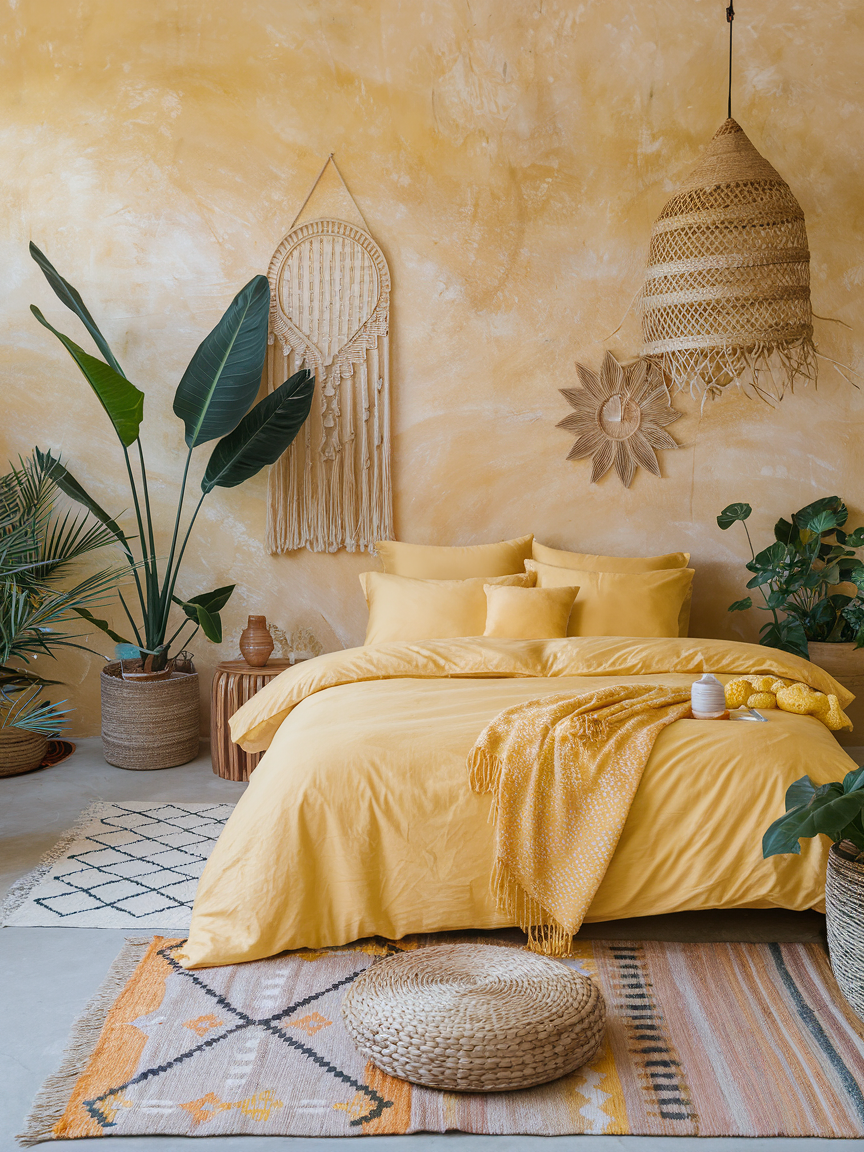 Bohemian styling embraces a mix of textures, patterns, and natural materials, making it a perfect match for yellow’s warmth. Layered rugs, woven accents, macramé details, and indoor plants create a relaxed, expressive atmosphere. Yellow enhances this aesthetic by adding brightness and cohesion. Mixing patterns and materials adds visual richness while maintaining harmony through a consistent palette. The result is a bedroom that feels creative, inviting, and full of personality.