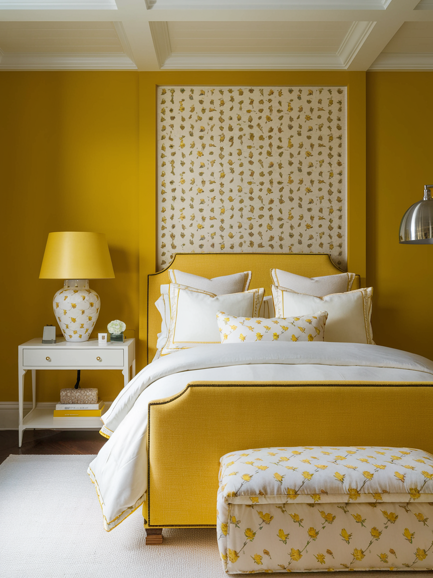 Floral patterns naturally enhance the cheerful and lively character of yellow bedrooms, bringing in a sense of movement and organic beauty. Whether incorporated through bedding, wallpaper, curtains, or accent pillows, florals add personality and visual interest without disrupting the overall harmony. Yellow tones within floral designs can highlight the patterns, making them feel cohesive rather than overwhelming. To maintain balance, it’s important to pair floral elements with solid colors and simple furnishings. This ensures the space feels curated rather than busy. Floral patterns work especially well in cottage, vintage, or romantic interiors, where they contribute to a soft, inviting atmosphere. The result is a bedroom that feels vibrant, charming, and full of life.