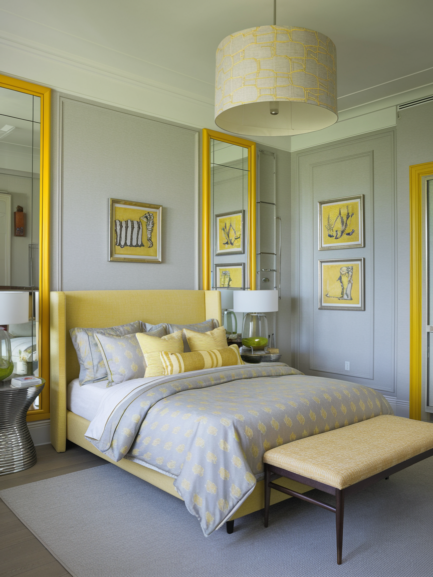 The pairing of yellow and grey creates a sophisticated balance that feels both modern and approachable. Grey acts as a calming neutral, grounding the vibrancy of yellow and preventing it from dominating the room. Light grey walls combined with yellow accents create a fresh, airy look, while deeper charcoal tones add contrast and depth for a more dramatic effect. This color combination works particularly well in contemporary bedrooms with clean lines and minimal decor. Incorporating textures such as soft fabrics, matte finishes, and subtle patterns enhances the overall design. The interplay between warm and cool tones results in a bedroom that feels visually balanced, stylish, and comfortable—perfect for those seeking a refined yet cheerful aesthetic.