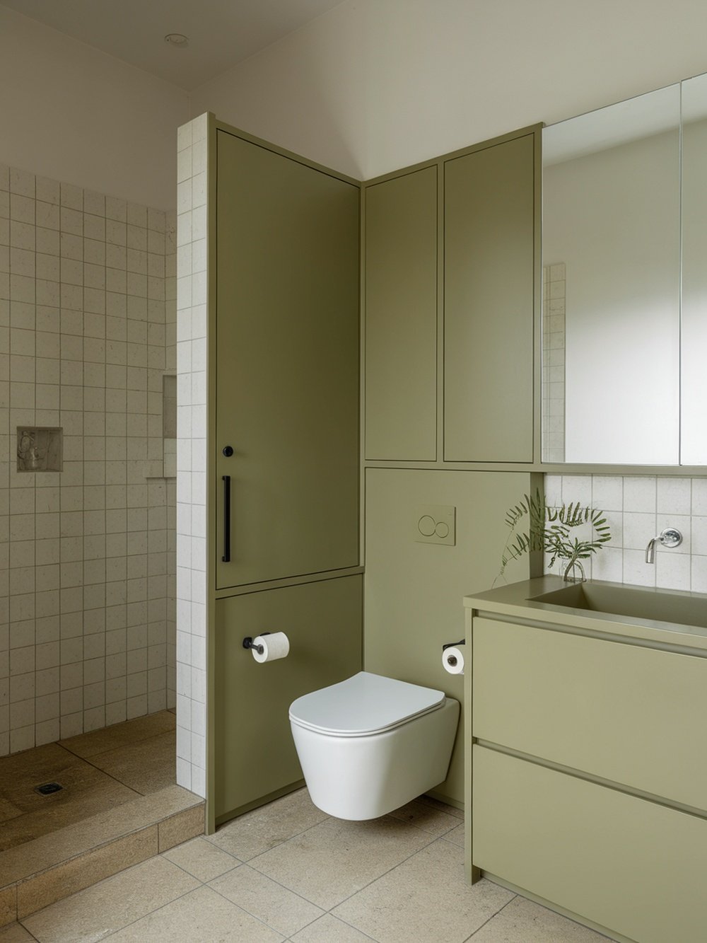 Olive green is a fantastic choice for a minimalistic bathroom. This shade brings a touch of nature indoors, creating a calming atmosphere. The image showcases a sleek design with clean lines and a simple color palette. The cabinetry and walls in olive green blend seamlessly, providing a cohesive look. The white fixtures, like the toilet and sink, pop against the green, adding brightness to the space. This contrast keeps the design fresh and inviting.