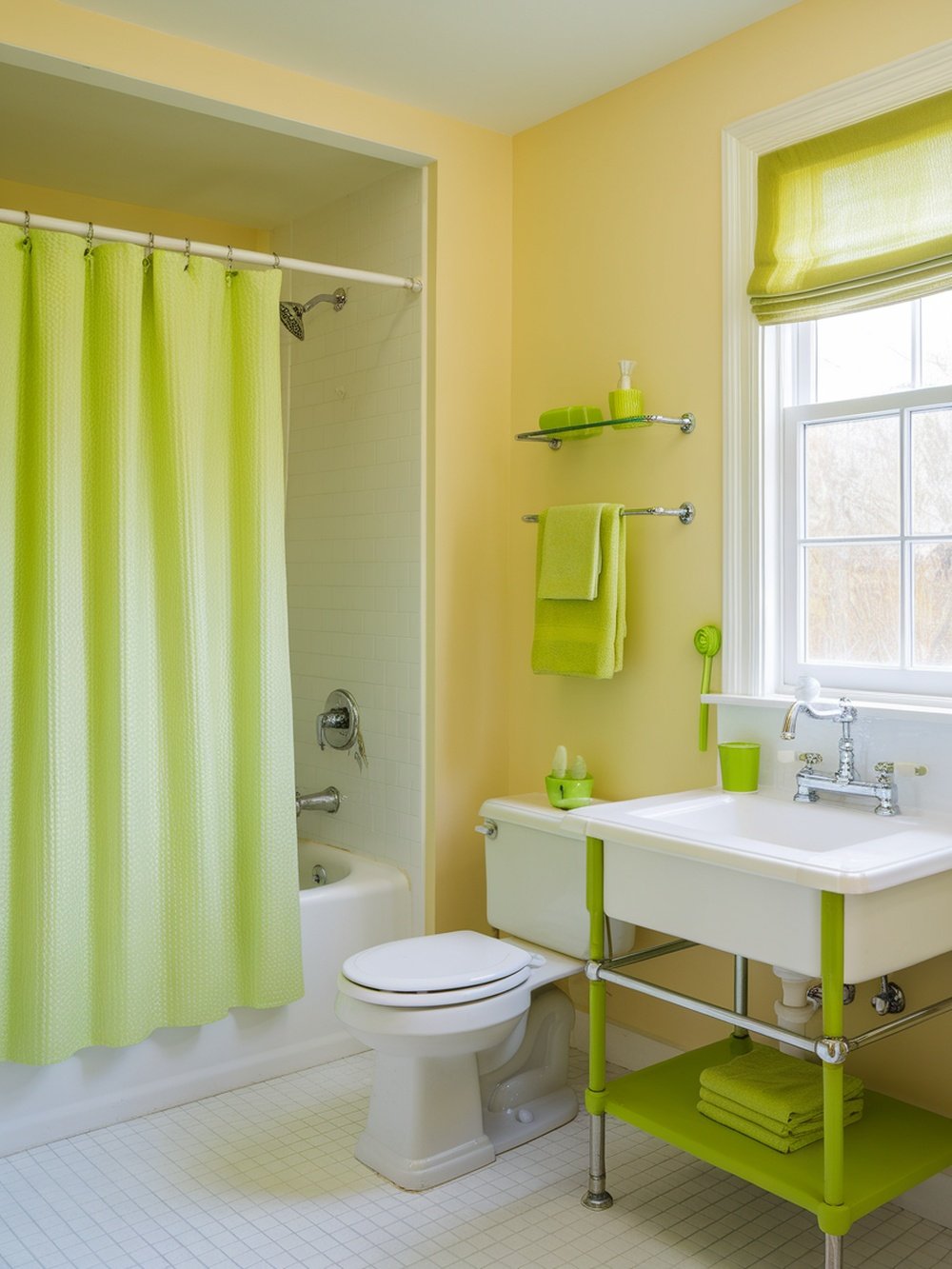 Bright and cheerful, this bathroom design showcases citrus green accents that instantly uplift the space. The vibrant shower curtain and matching towels create a playful vibe, making the bathroom feel fresh and inviting.