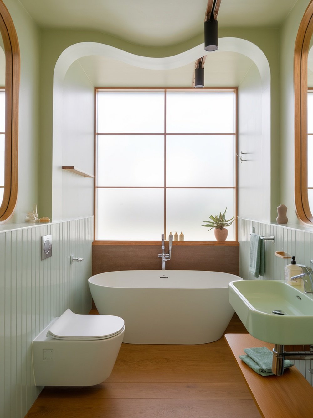 This bathroom design showcases a lovely blend of pastel green tones and warm wood elements. The soft green walls create a calming atmosphere, perfect for a relaxing space. The unique curves of the architecture add a modern touch, making the room feel inviting and fresh.