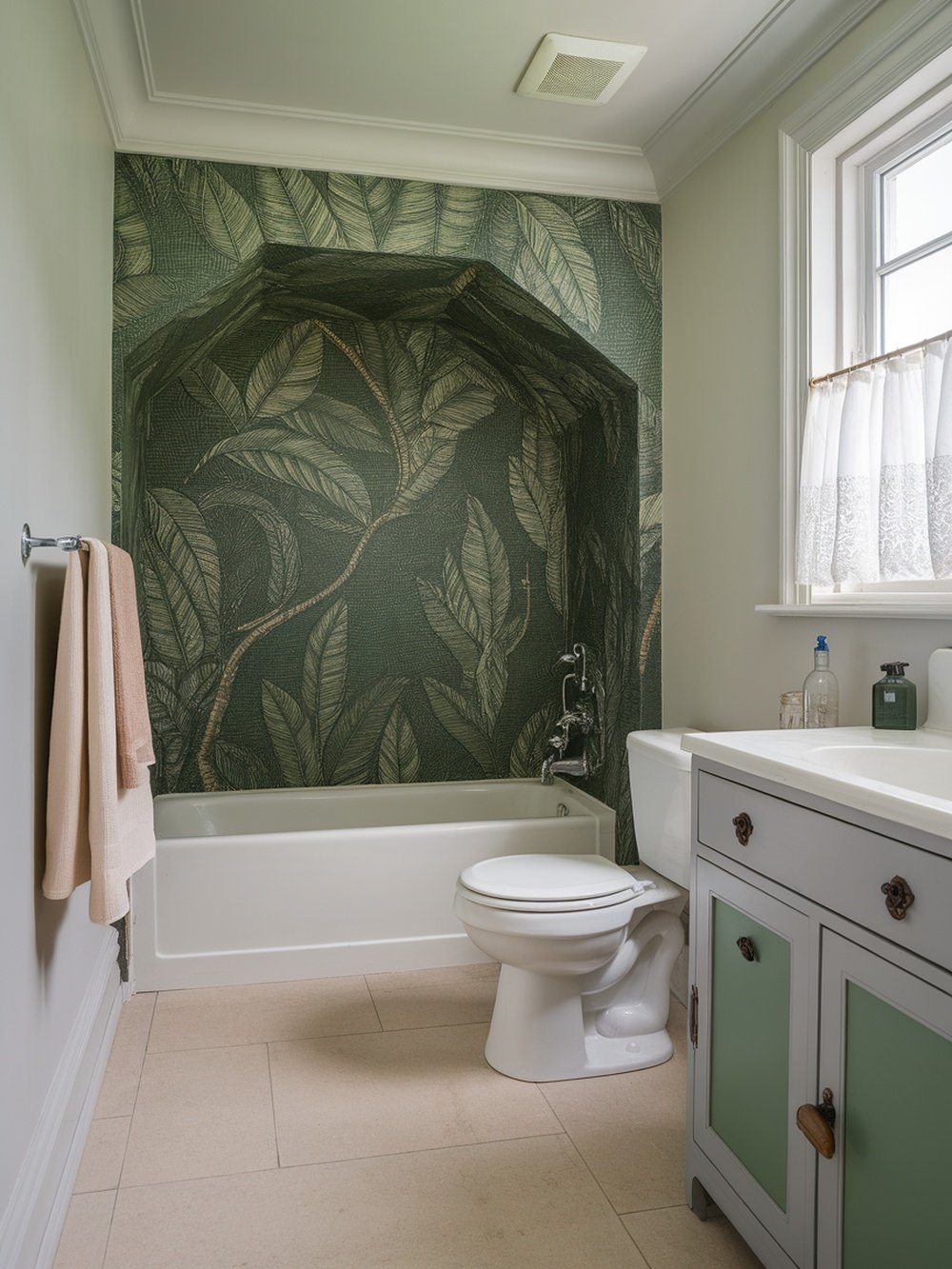 The combination of the green wallpaper with the light-colored fixtures and natural light streaming in from the window creates a balanced look. It’s a great way to bring the outdoors inside, making your bathroom feel like a serene retreat. Pairing this wallpaper with simple accessories, like soft towels and a light wood vanity, can enhance the overall aesthetic. The subtle elegance of the wallpaper allows for flexibility in decor choices, making it easy to switch up the style whenever you want.